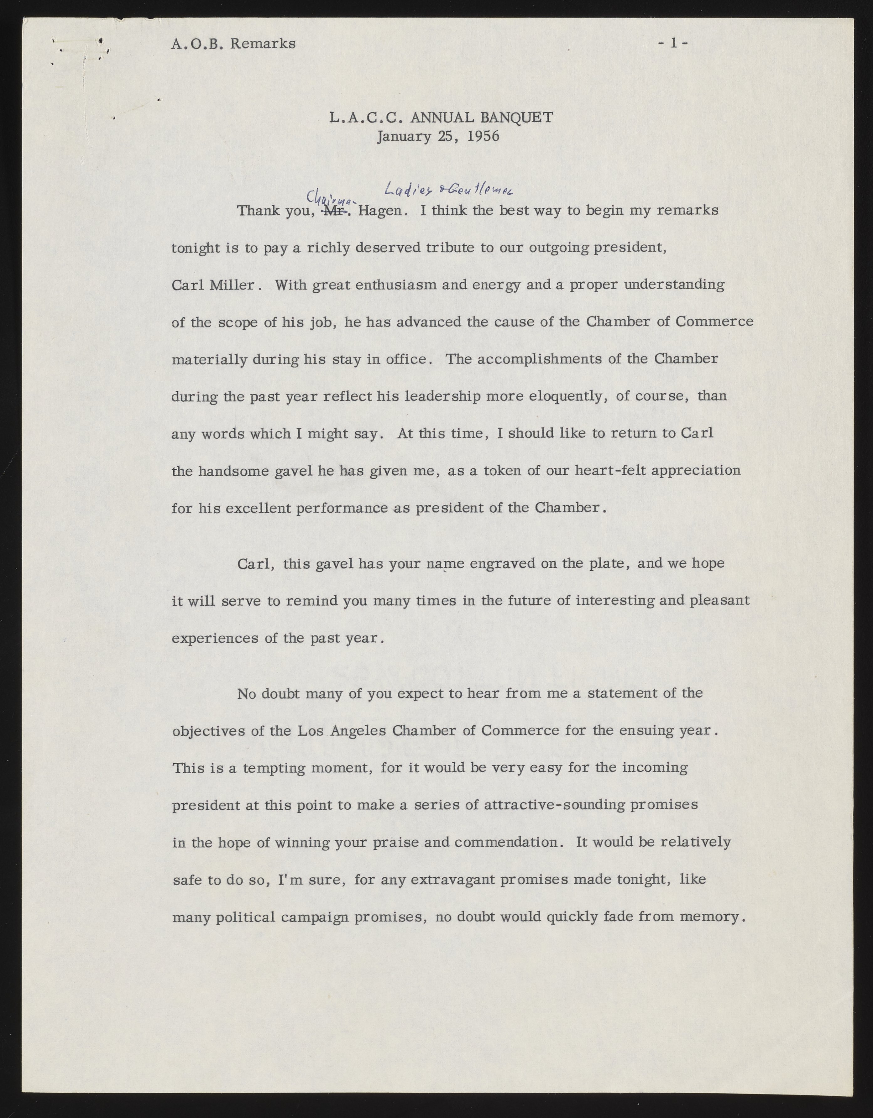 Arnold O. Beckman's remarks at the Los Angeles Chamber of Commerce Annual Banquet