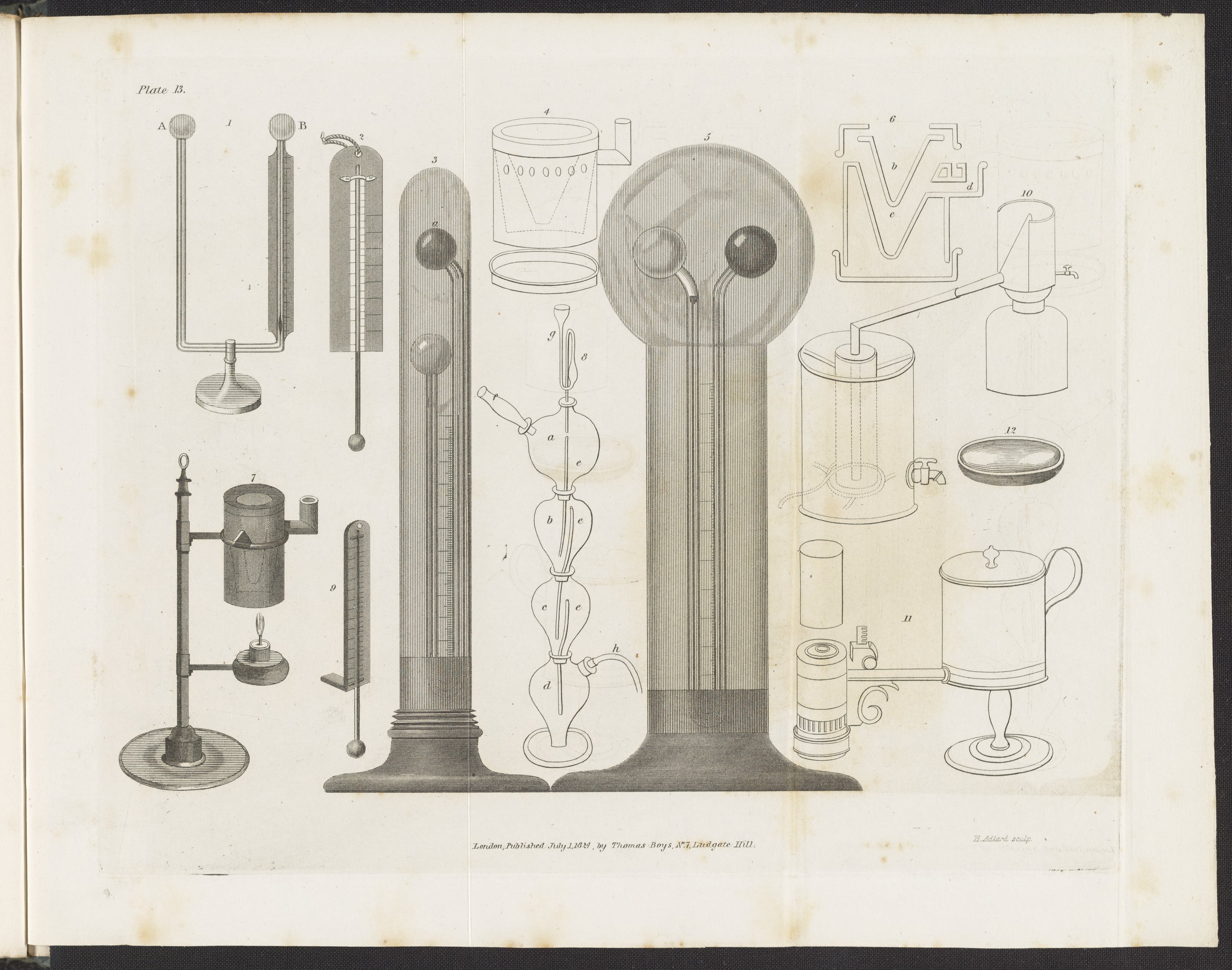 Accum, Friedrich Christian. “Plate 13: Thermometers; Photometers; Steam Baths.” In An Explanatory Dictionary of the Apparatus and Instruments Employed in the Various Operations of Philosophical and Experimental Chemistry. London, England: Thomas Shotter Boys, 1824. https://digital.sciencehistory.org/works/3t945q81n.