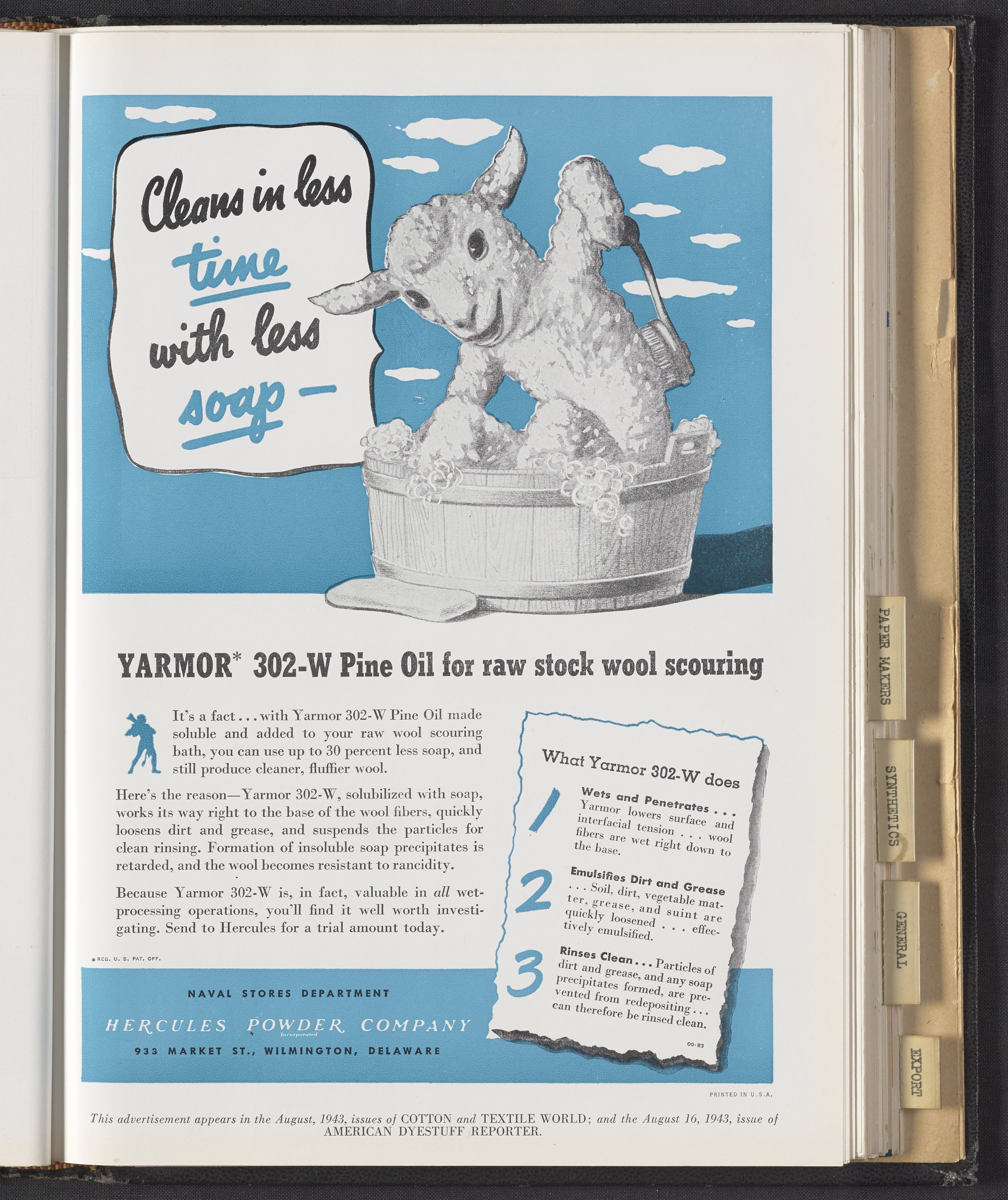 Hercules Incorporated. “Cleans in Less Time with Less Soap.” 1943 Hercules Advertisements, 1943. Records of Hercules Incorporated, Volume 1943. Science History Institute. Philadelphia. https://digital.sciencehistory.org/works/3t945r56h.
