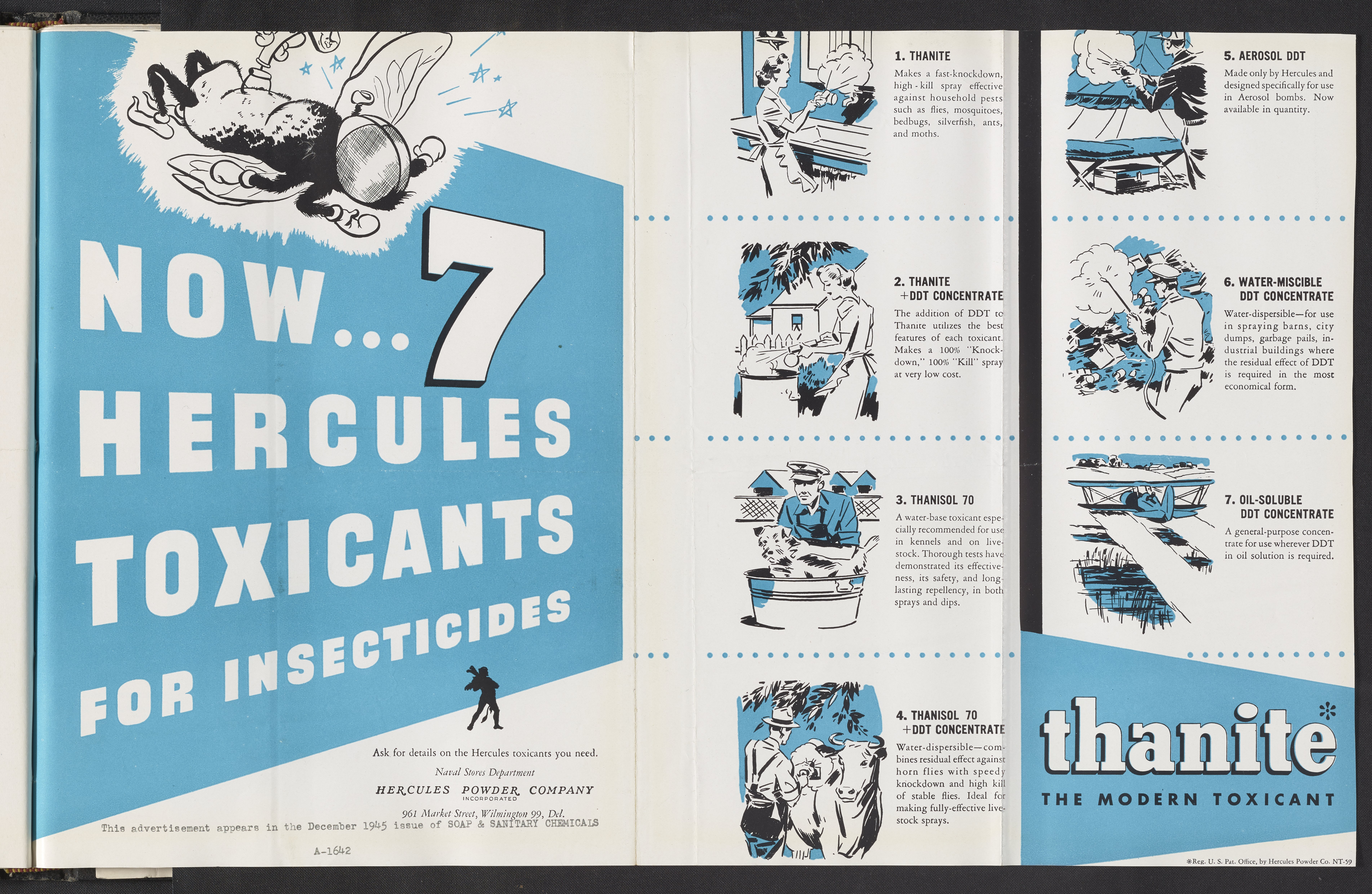 Hercules Incorporated. “Now...7 Hercules Toxicants for Insecticides.” 1945 Hercules Advertisements, 1945. Records of Hercules Incorporated, Volume 1945. Science History Institute. Philadelphia. https://digital.sciencehistory.org/works/3t945r57s.
