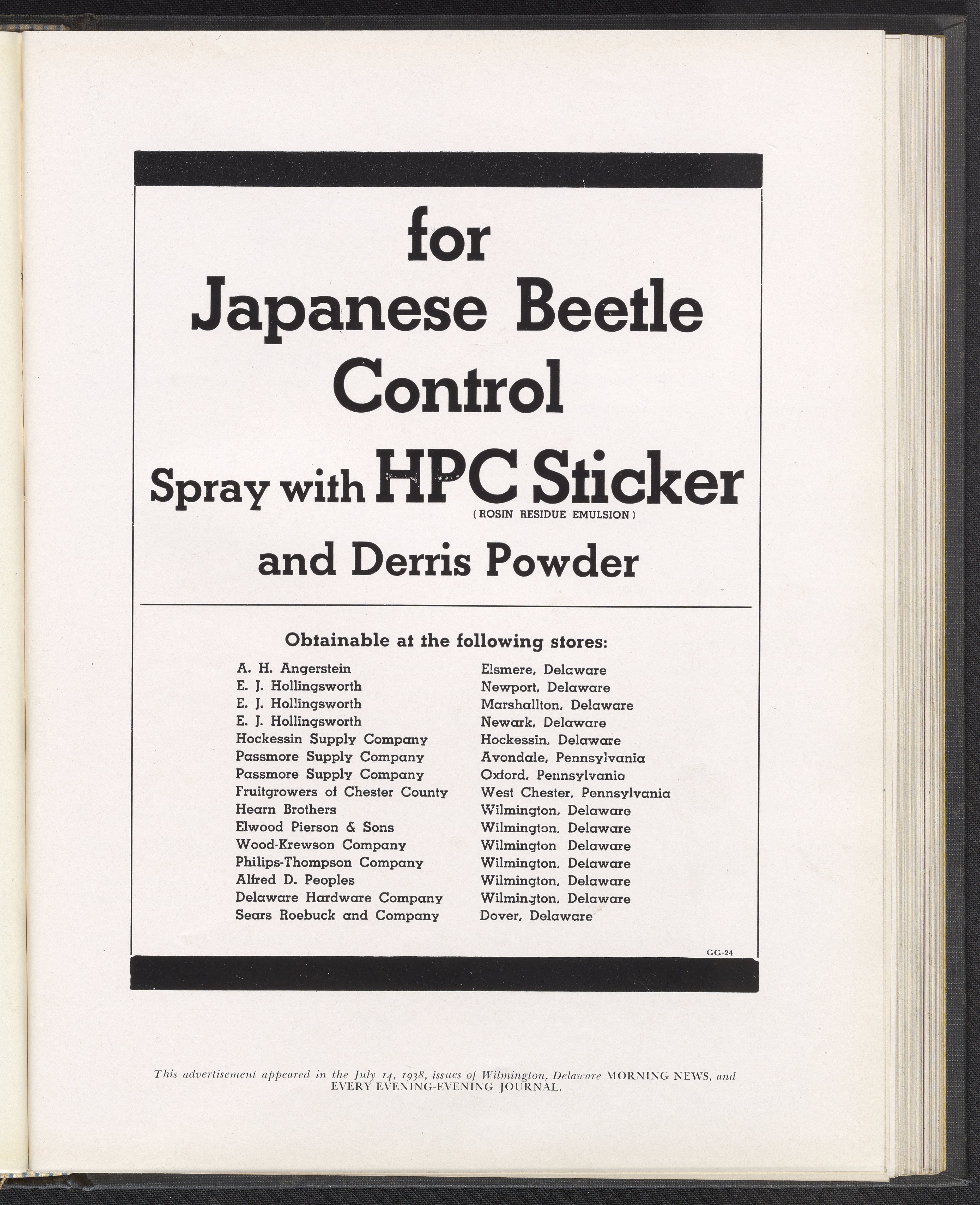 Hercules Incorporated. “For Japanese Beetle Control Spray with HPC Sticker and Derris Powder.” 1938 Hercules Advertisements, 1938. Records of Hercules Incorporated, Volume 1938. Science History Institute. Philadelphia. https://digital.sciencehistory.org/works/3t945r646.
