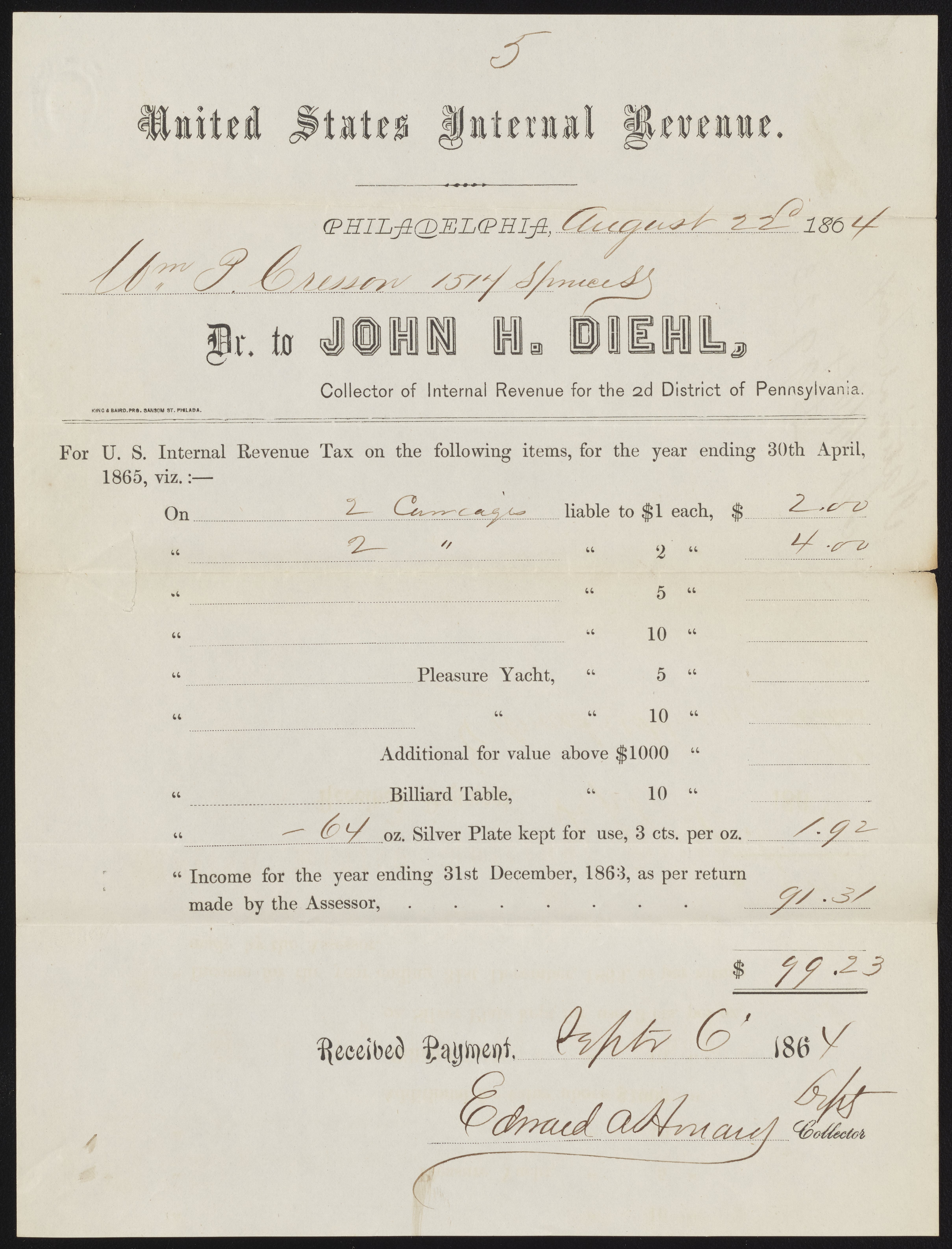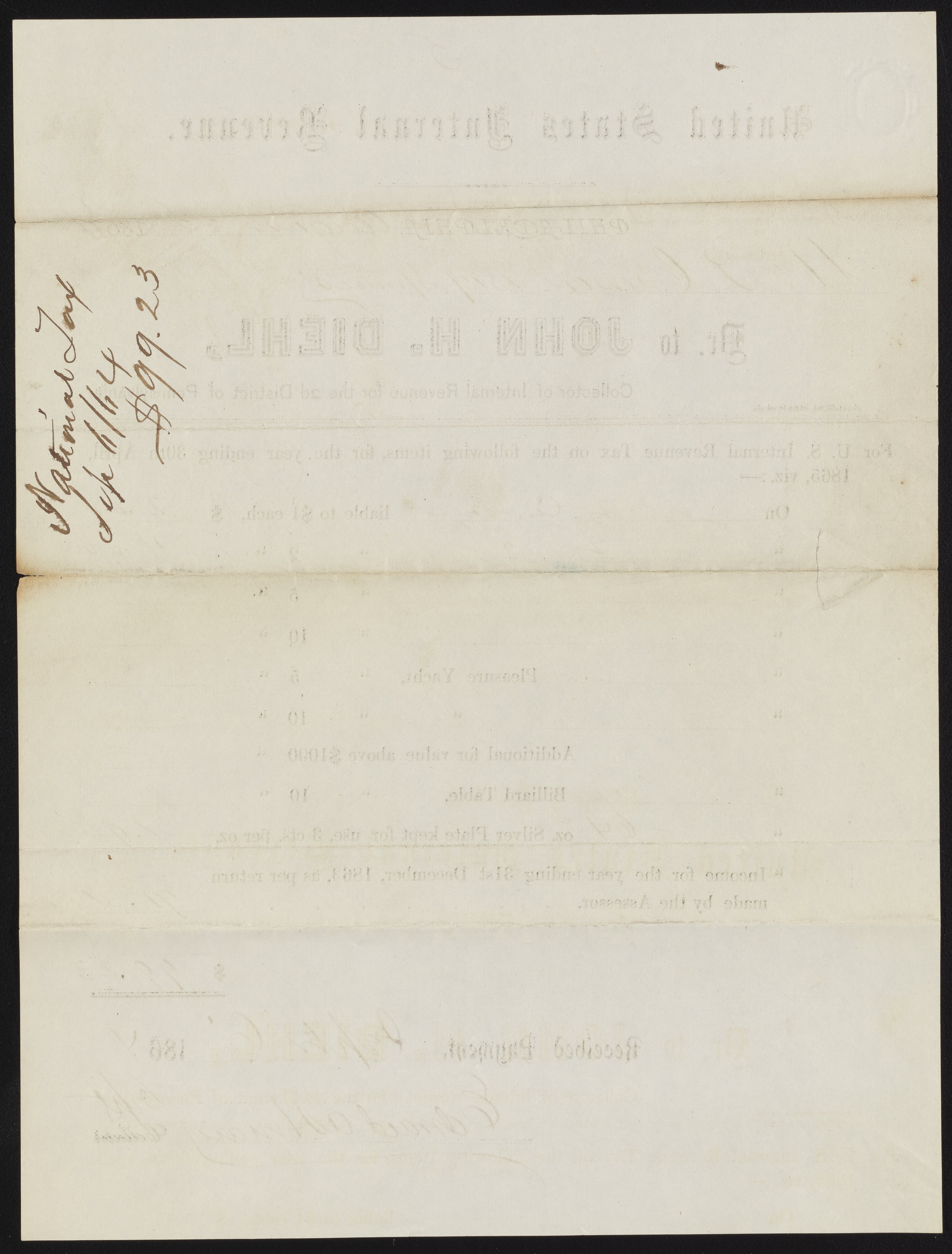Receipt from the National Tax for John H. Diehl