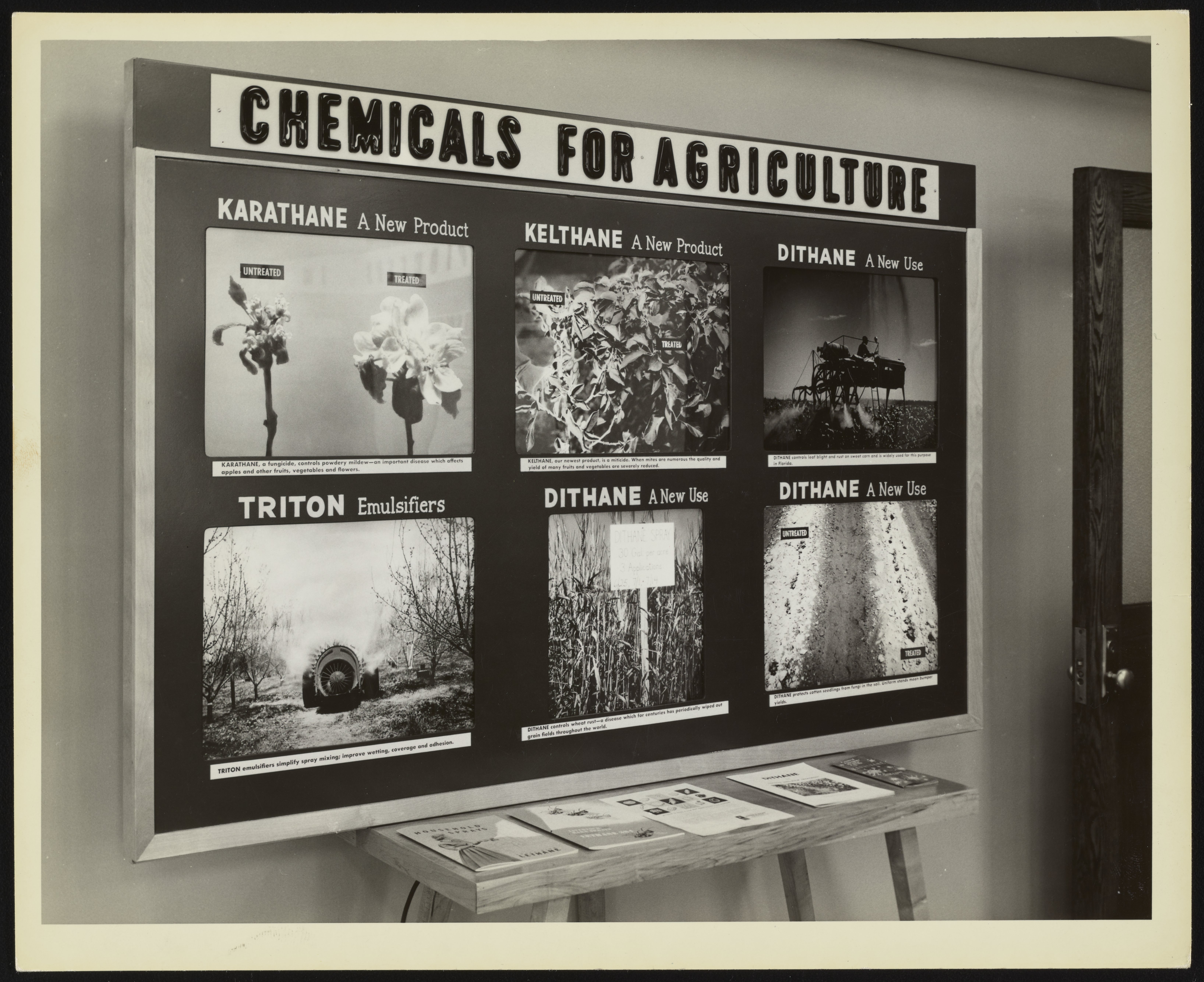 Rohm and Haas Company. “Chemicals for Agriculture Exhibit Board,” April 19, 1956. Rohm & Haas Company Archives, Box Photos 20, Folder 28. Science History Institute. Philadelphia. https://digital.sciencehistory.org/works/3we0wen.