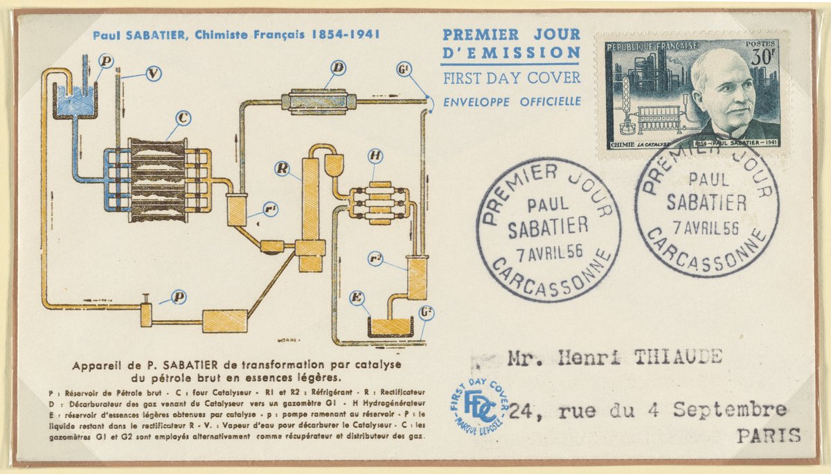 “First Day Cover Commemorating Paul Sabatier.” France, 1956. Witco Stamp Collection, Box 3. Science History Institute. Philadelphia. https://digital.sciencehistory.org/works/3x816m68b.