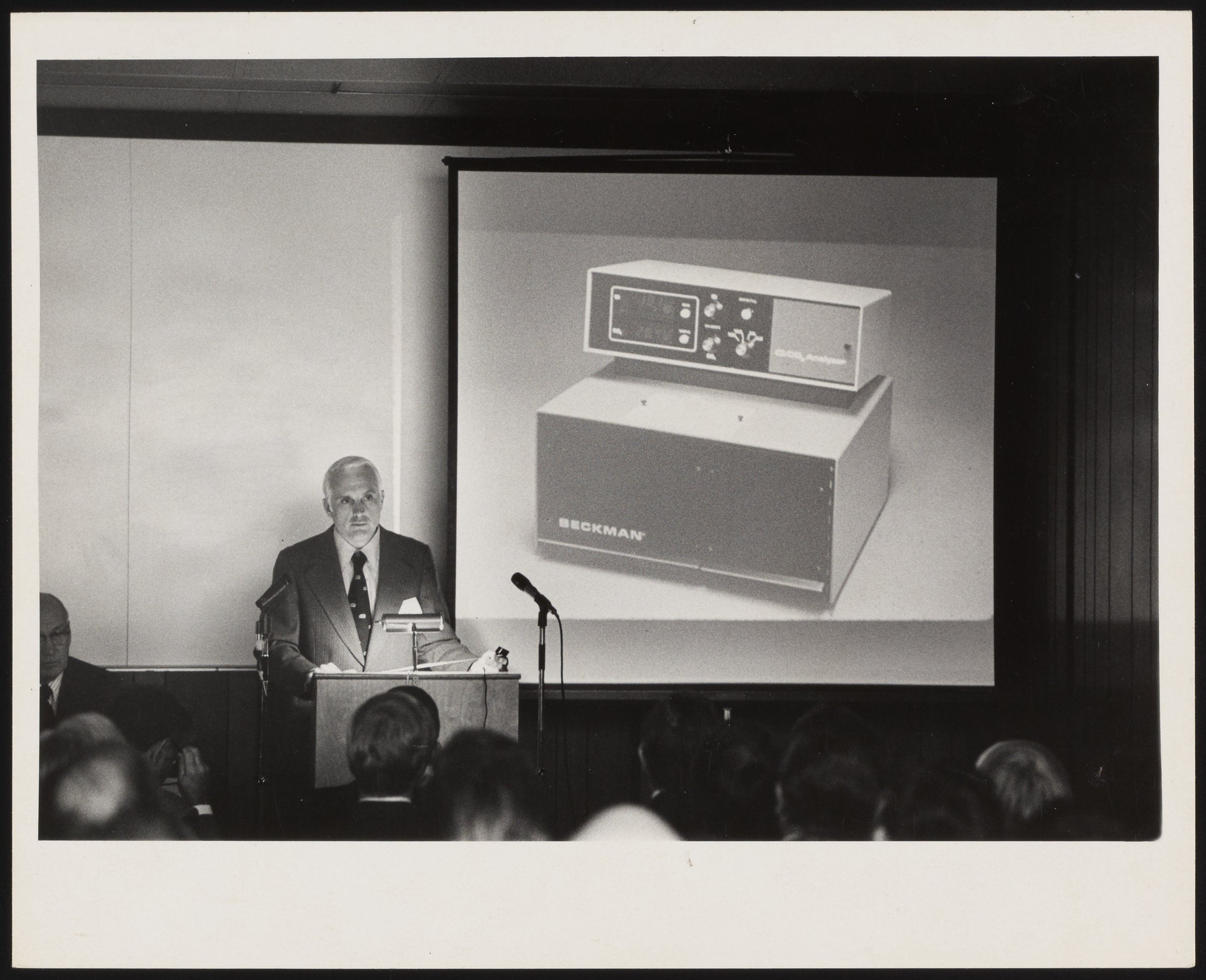 Allan Dean Walker Photography. “Unidentified Man Giving a Presentation about a Beckman Cl/CO2 Analyzer,” 1975–1984. Beckman Historical Collection, Box 58, Folder 83. Science History Institute. Philadelphia. https://digital.sciencehistory.org/works/3x816m71n.