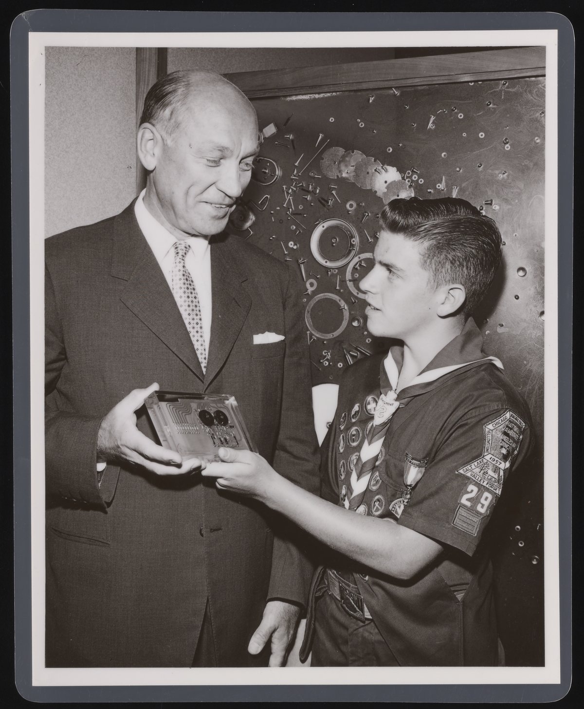 Rothschild Photo. “Arnold Beckman at an Eagle Scout Award Ceremony,” October 1957. Beckman Historical Collection, Box 56, Folder 57. Science History Institute. Philadelphia. https://digital.sciencehistory.org/works/3x816n083.