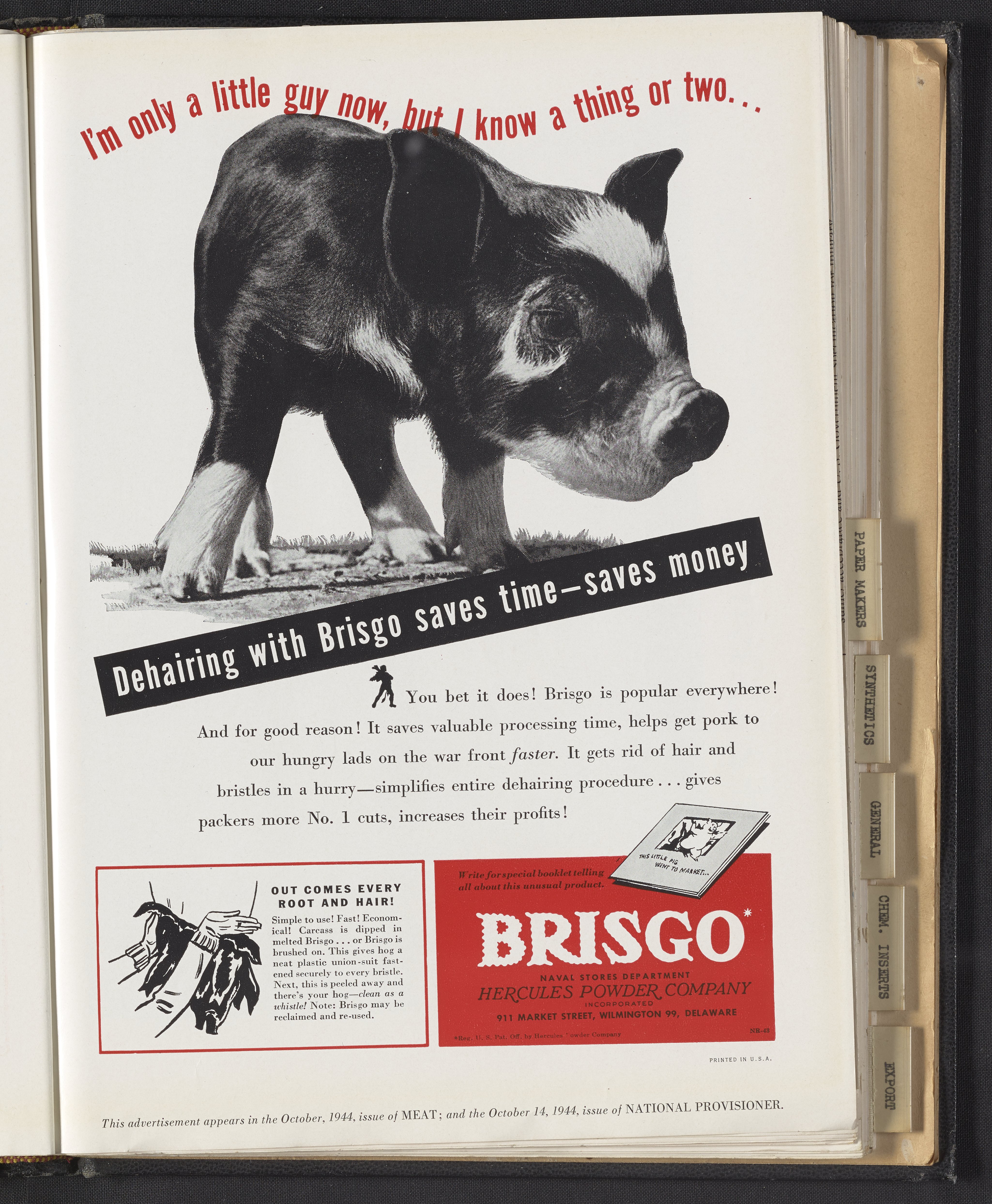 Hercules Incorporated. “Dehairing with Brisgo Saves Time--Saves Money.” 1944 Hercules Advertisements, 1944. Records of Hercules Incorporated, Volume 1944. Science History Institute. Philadelphia. https://digital.sciencehistory.org/works/3x816n37j.