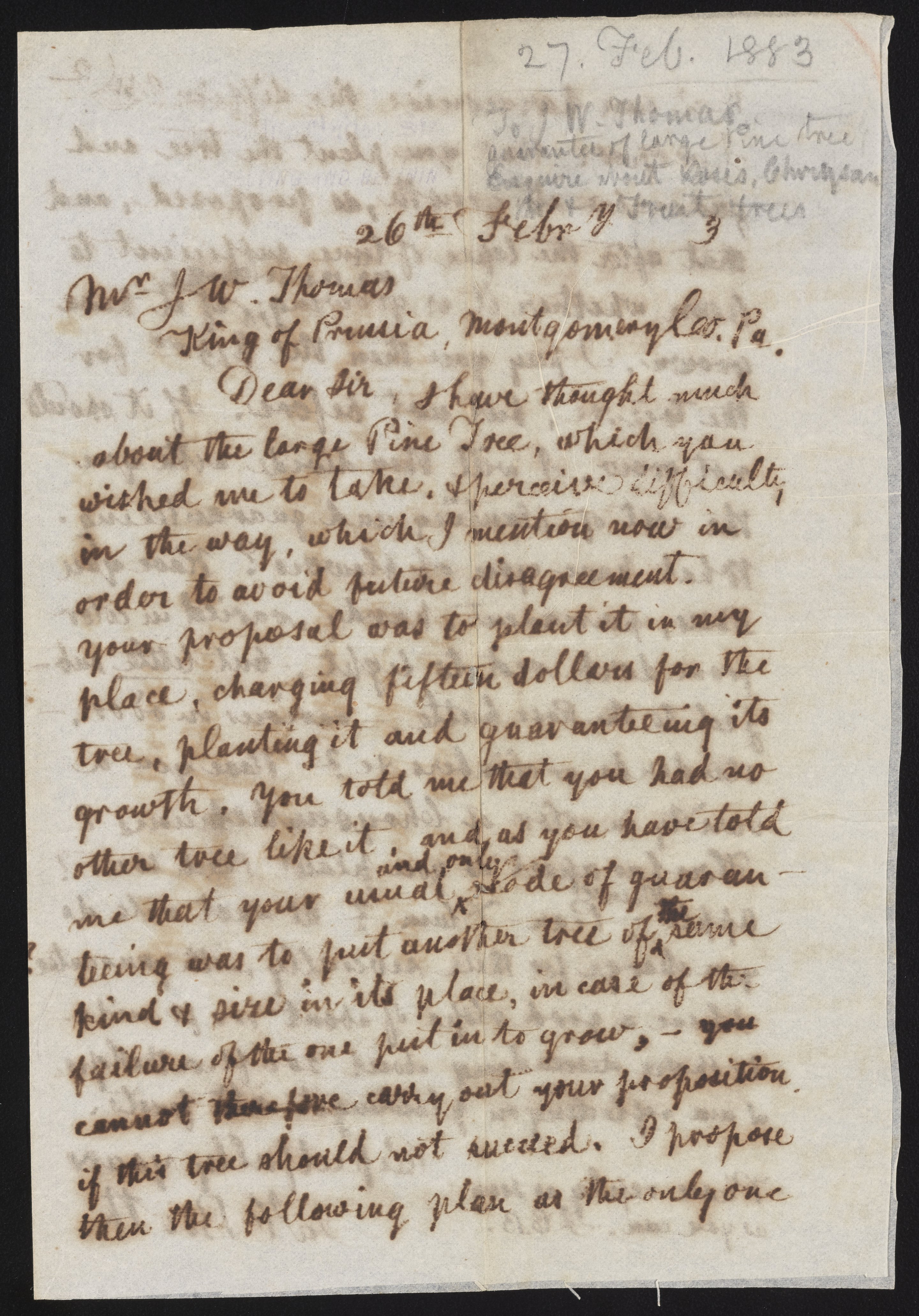 Small JPG1200 x 1718px — 393 KBLarge JPG2880 x 4123px — 1.9 MBFull-sized JPG3704 x 5302px — 3.0 MBOriginal fileTIFF — 3704 x 5302px — 56.2 MBJames Curtis Booth (1810-1888) discusses Joseph W. Thomas' proposal to sell him a large pine tree.