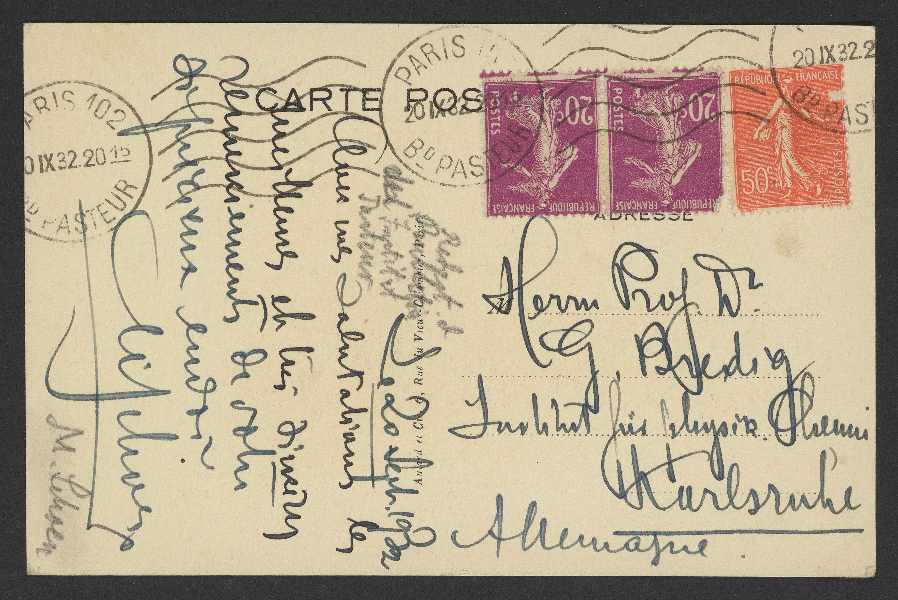 Petit, Pierre Lanith. “Postcard of Louis Pasteur,” September 20, 1932. Papers of Georg and Max Bredig, Box 22. Science History Institute. Philadelphia. https://digital.sciencehistory.org/works/3zmfn06.