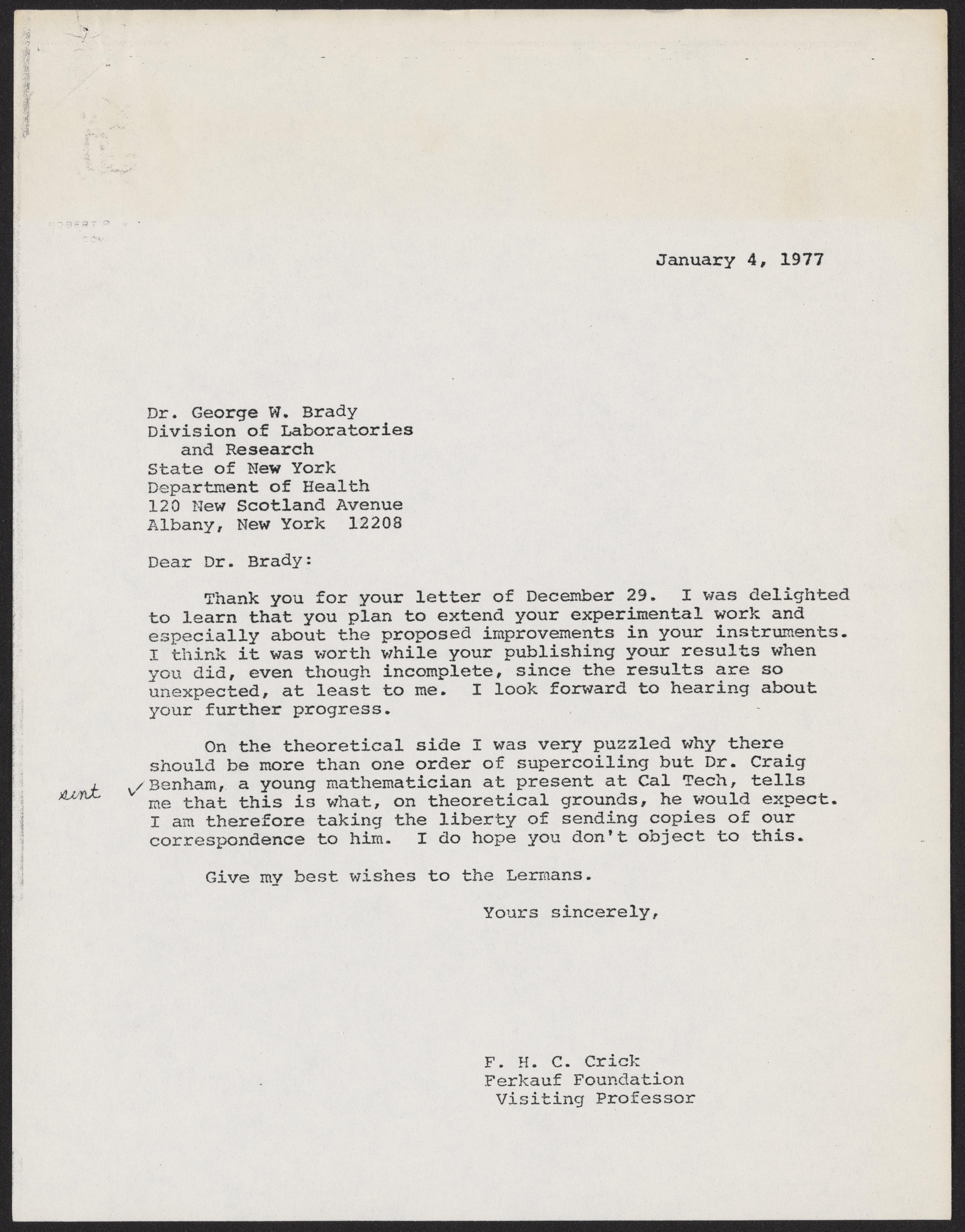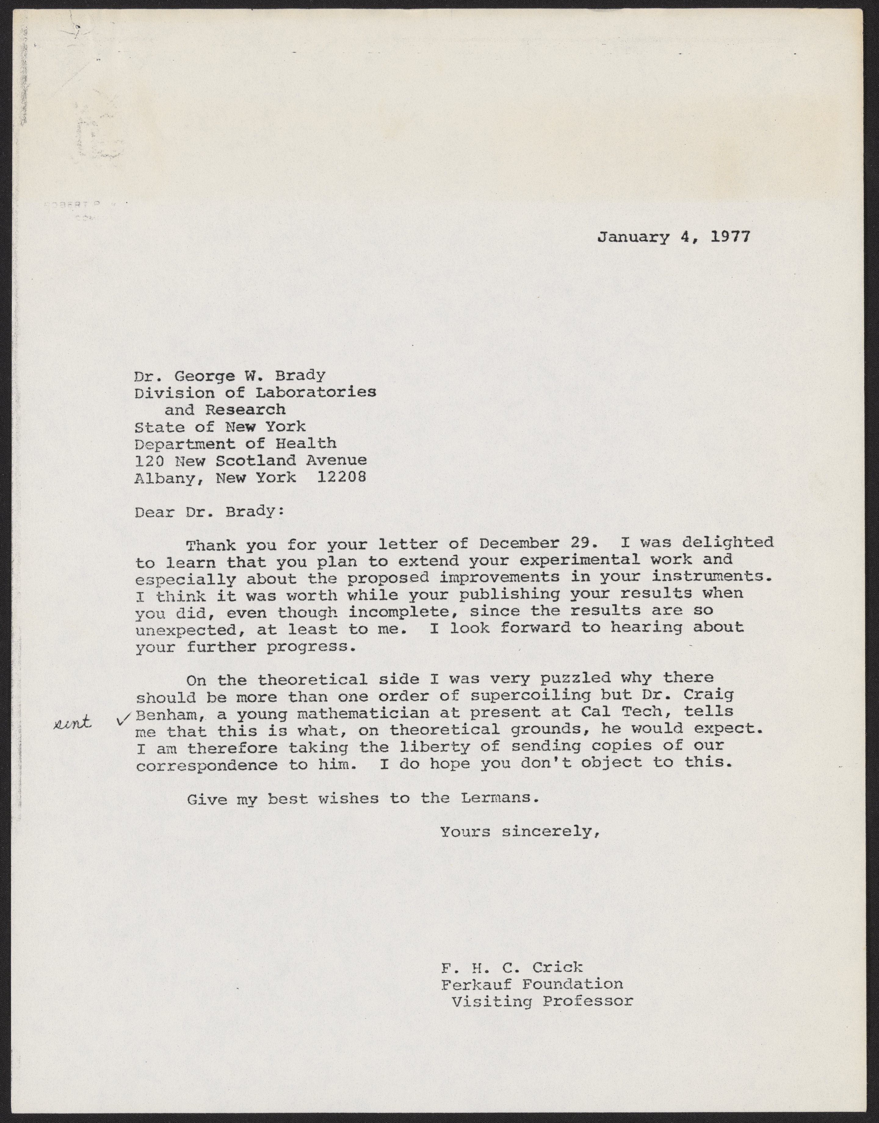 Letter from Francis Crick to George W. Brady, January 4, 1977