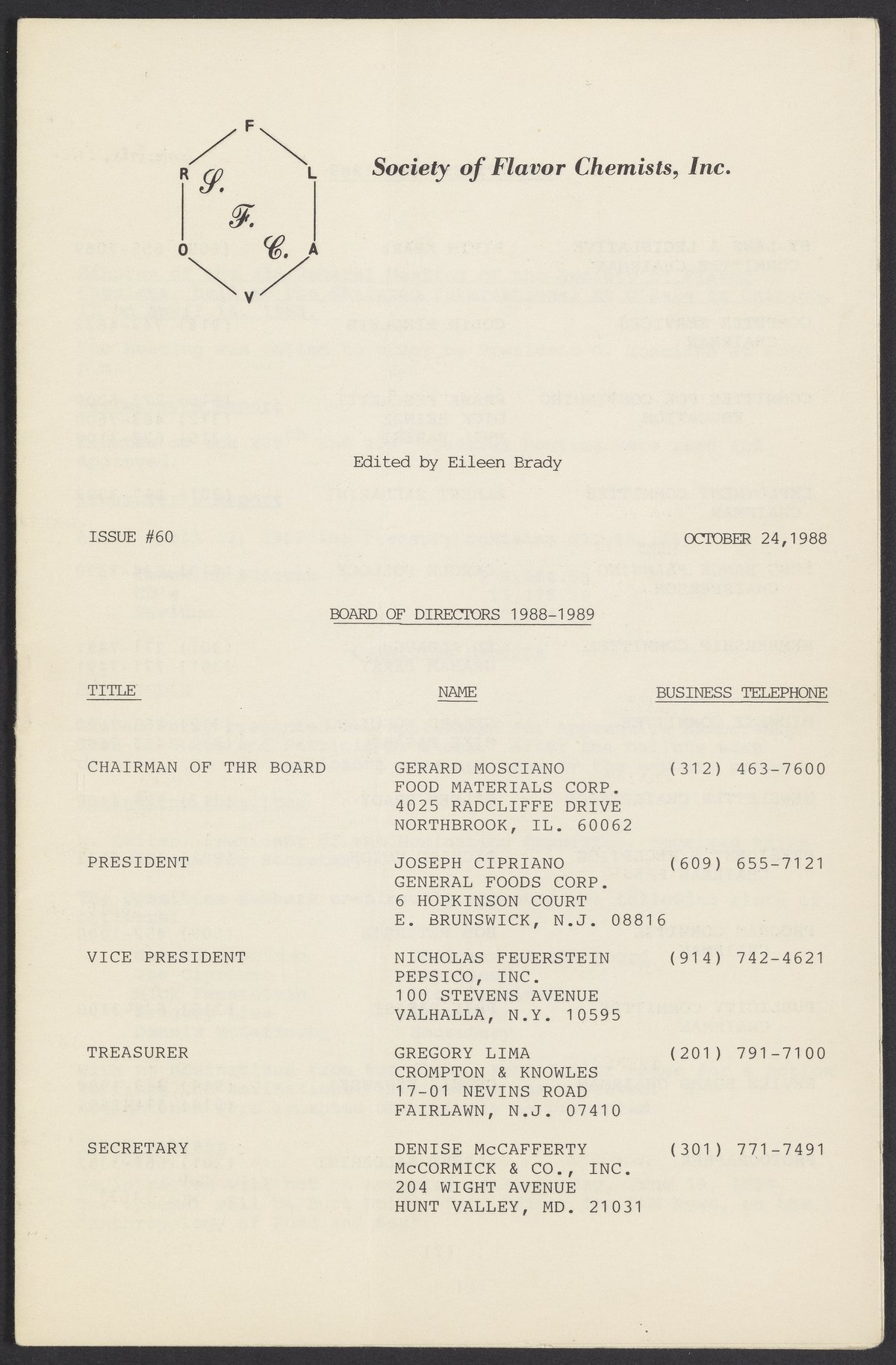 Society of Flavor Chemists. “Society of Flavor Chemists Newsletter, October 1988,” October 24, 1988. Society of Flavor Chemists Newsletters , Box 1, Folder 1. Science History Institute. Philadelphia. https://digital.sciencehistory.org/works/40fkd1r.