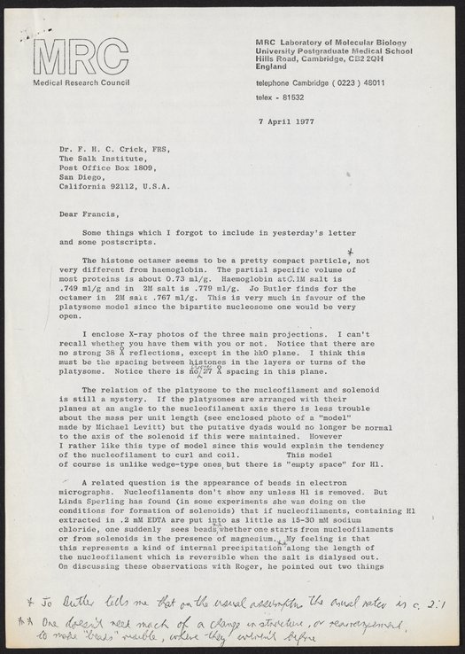 Letter from Aaron Klug to Francis Crick, April 7, 1977