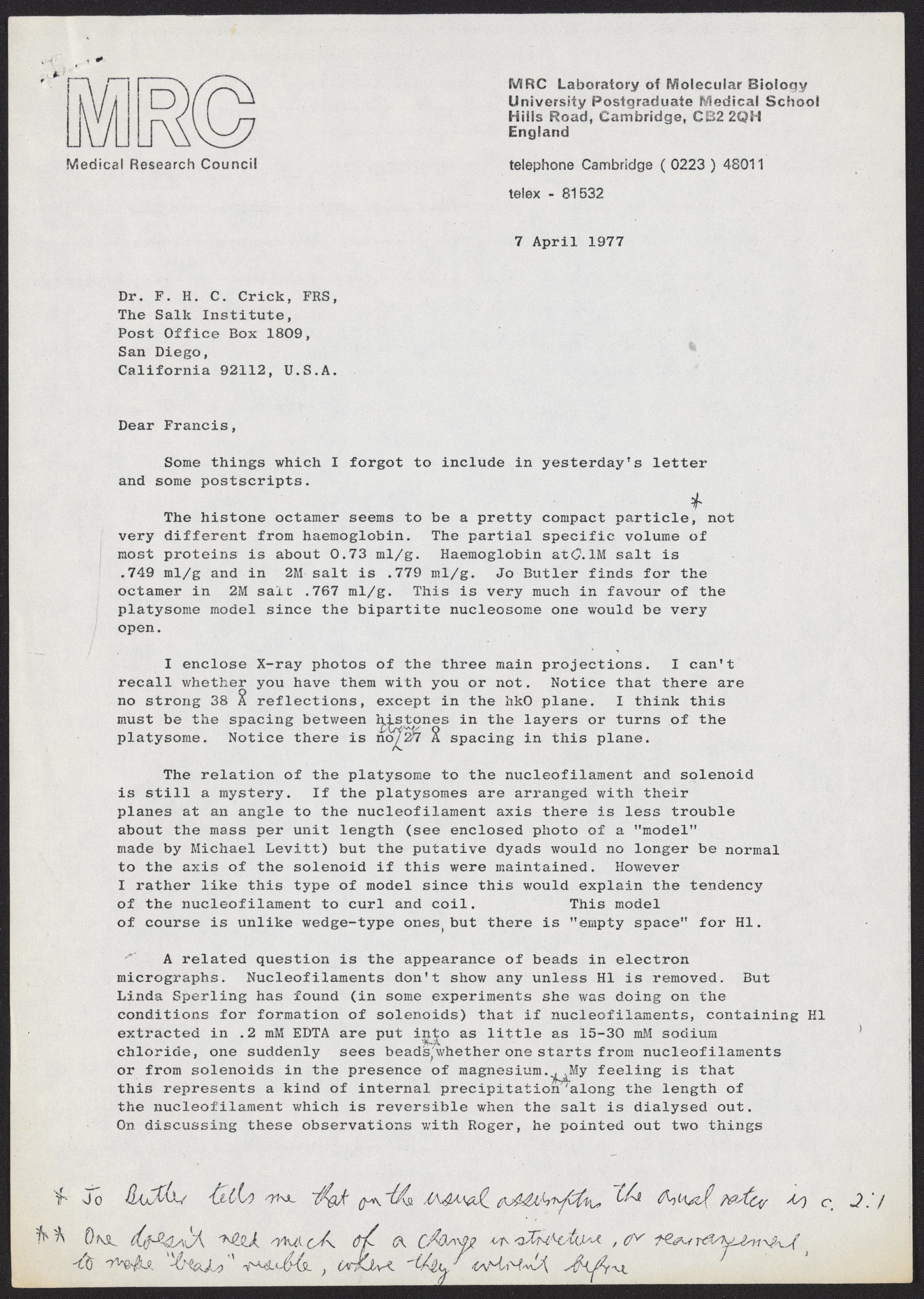 Klug, A. (Aaron), Sir. “Letter from Aaron Klug to Francis Crick, April 7, 1977,” April 7, 1977. History of Molecular Biology Collection, Box 20, Folder 1. Science History Institute. Philadelphia. https://digital.sciencehistory.org/works/417gqpn.