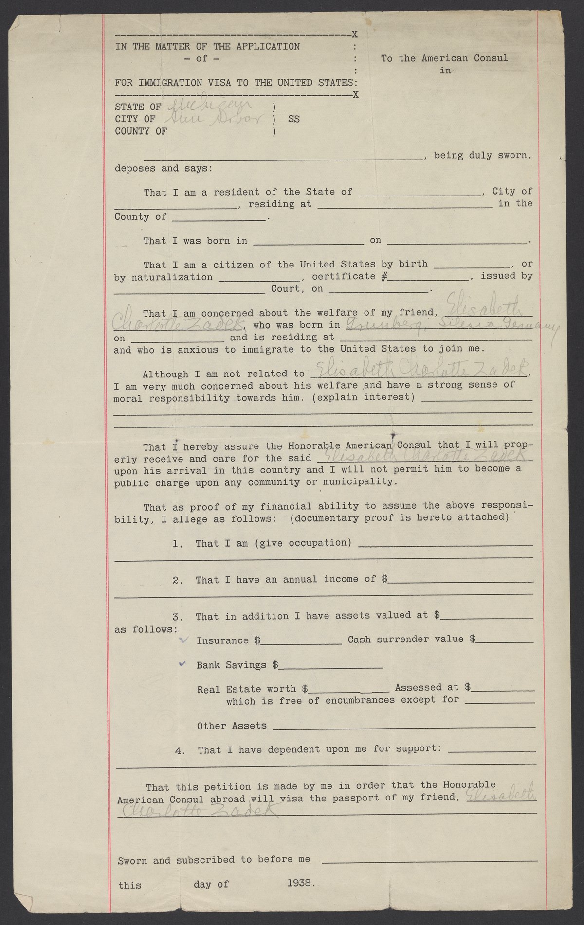 Application for immigration visa for Elizabeth Charlotte Zadek