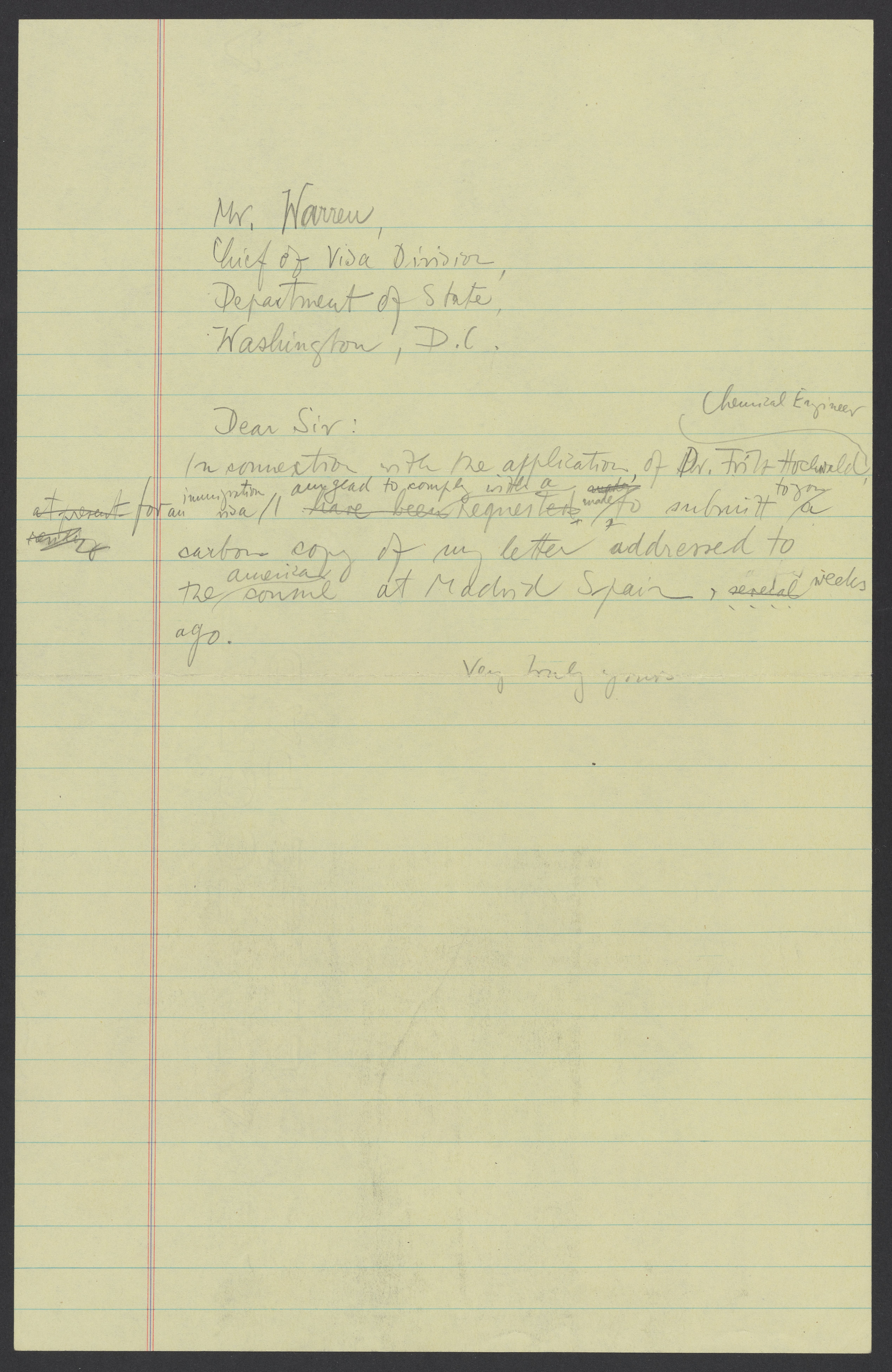 Small JPG1200 x 1543px — 378 KBLarge JPG2880 x 3703px — 2.6 MBFull-sized JPG5352 x 6882px — 8.1 MBOriginal fileTIFF — 5352 x 6882px — 105 MBMax Bredig (1902-1977) agrees to send a copy of his latest letter to the American Consul of Madrid, Spain to the U.S. Chief of Visas regarding Fritz Hochwald's (1897-1968) immigration visa.