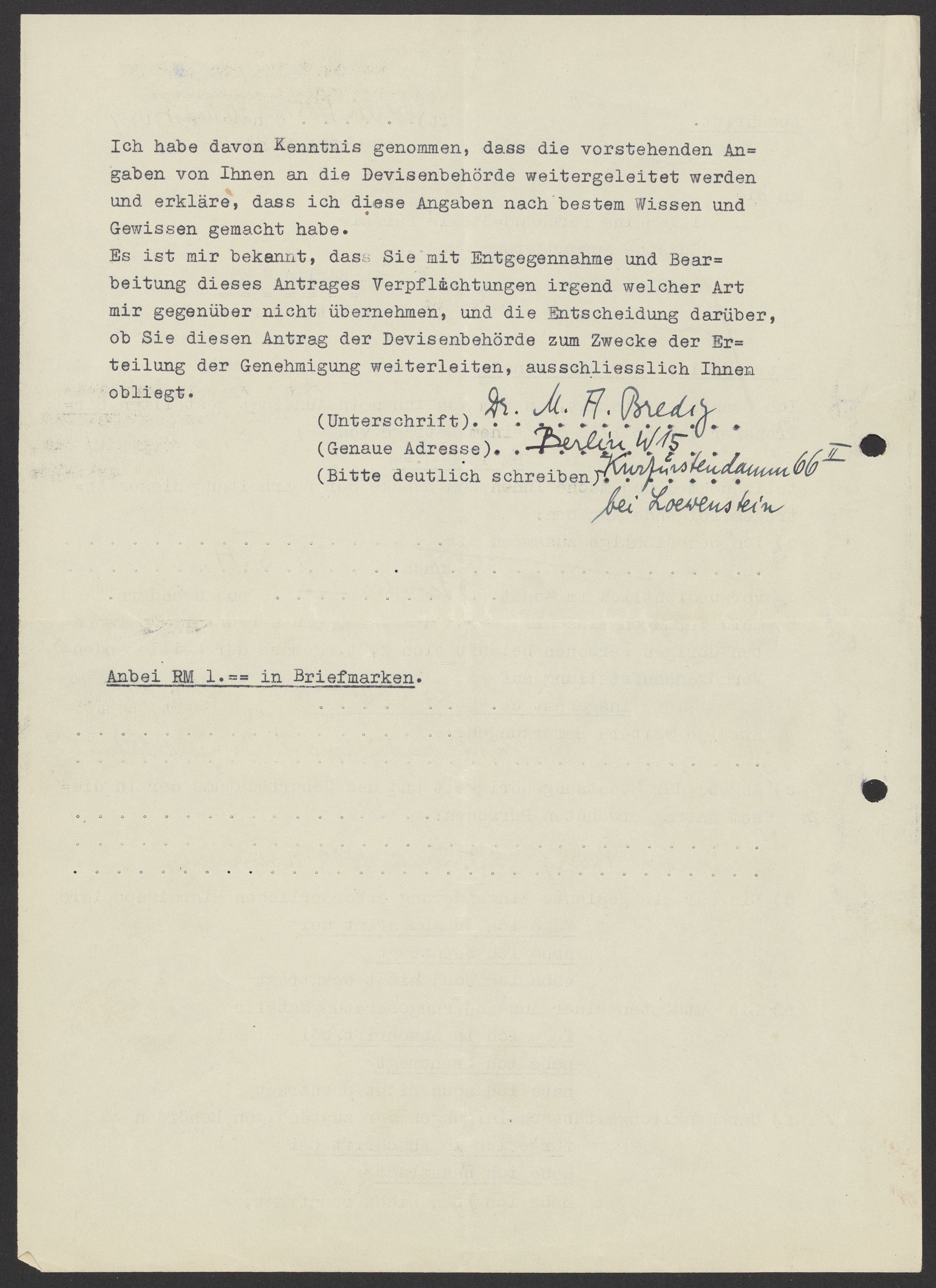 Letter from Max Bredig to the General Trust Office for Jewish Emigration, August 8, 1937