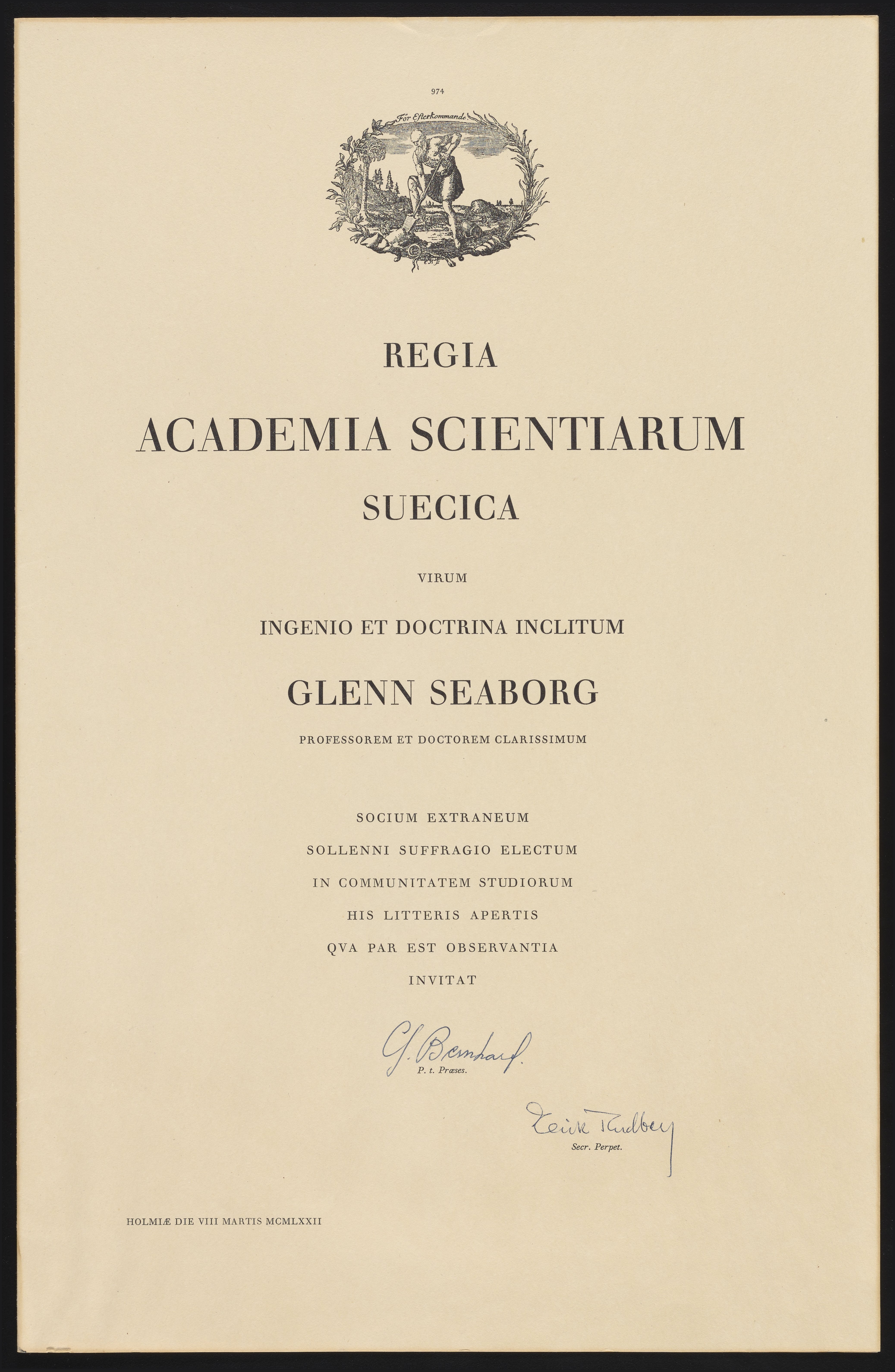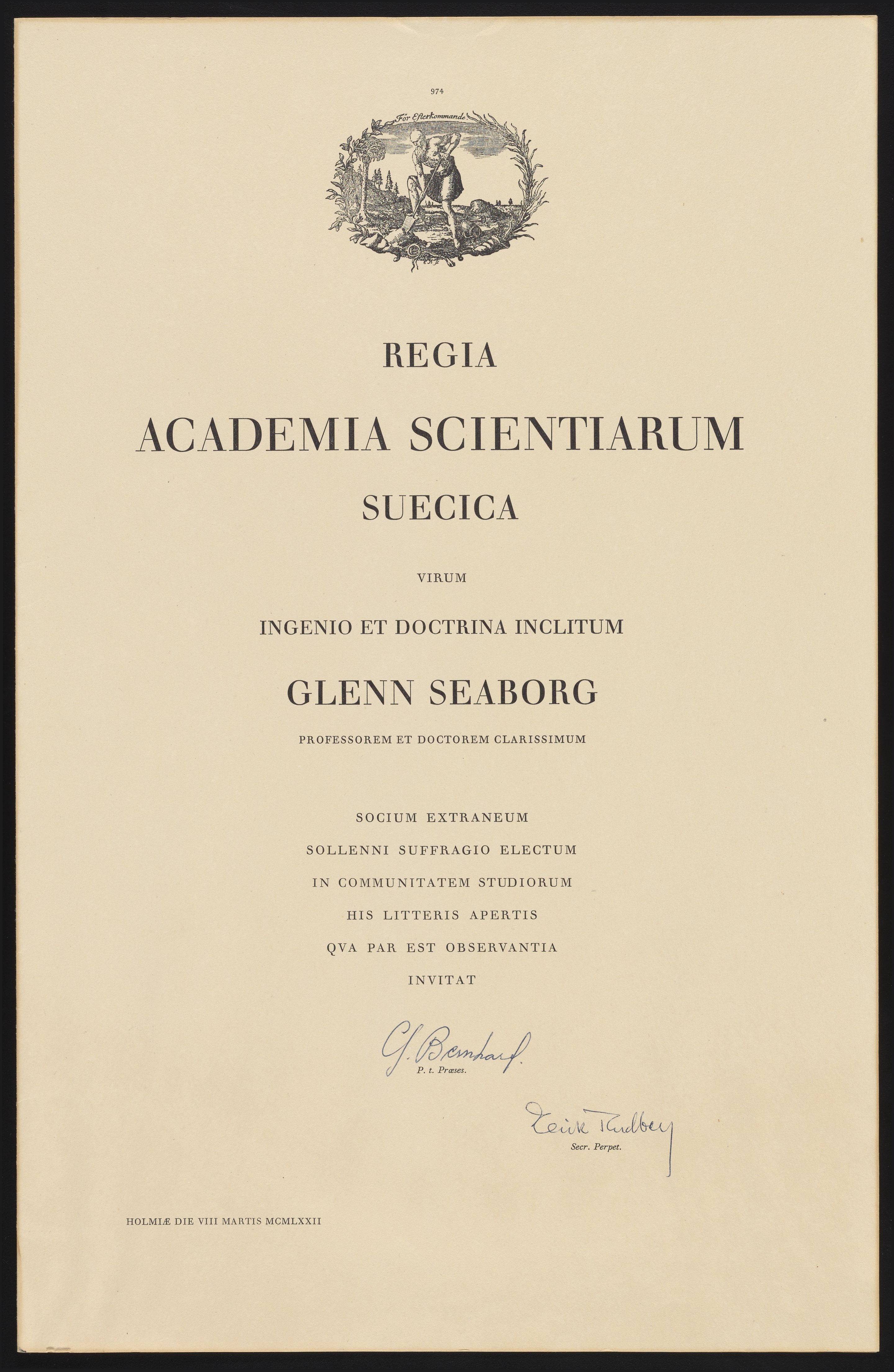 Kungl. Svenska vetenskapsakademien. “Certificate of Membership to Glenn Seaborg for the Royal Swedish Academy of Sciences,” 1972. Records of the Lawrence Berkeley National Laboratory - Nuclear Division, Folder 2. Science History Institute. Philadelphia. https://digital.sciencehistory.org/works/44558d35k.