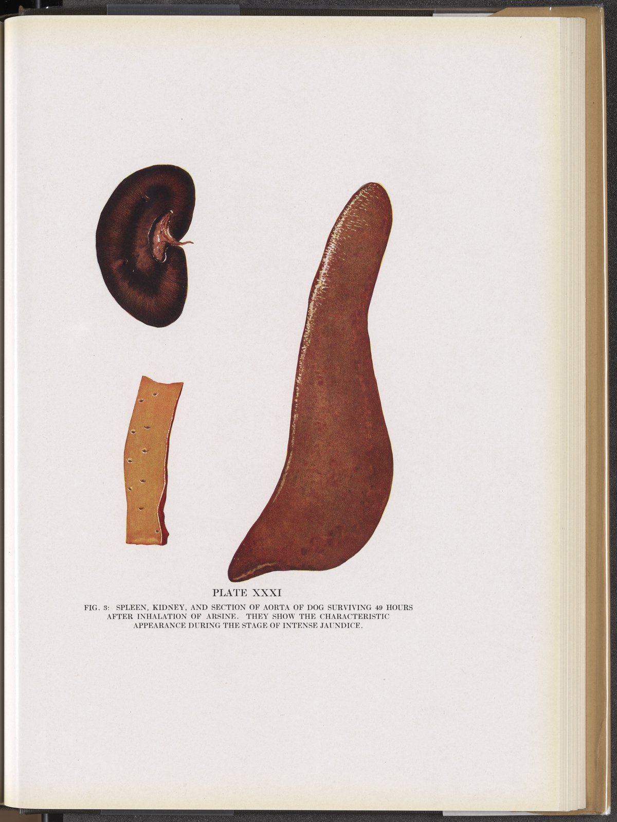 Plate XXXI (Fig. 3): Spleen, kidney, and section of aorta of dog surviving 49 hours after inhalation of arsine.