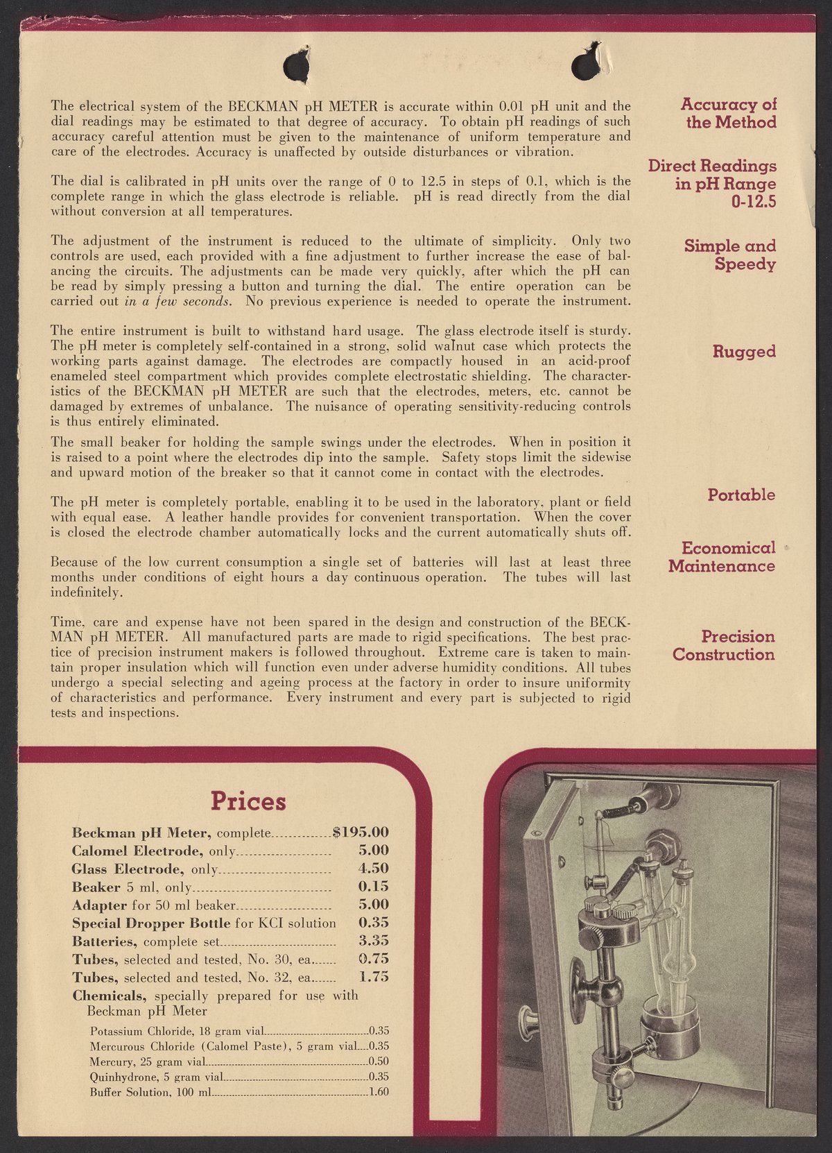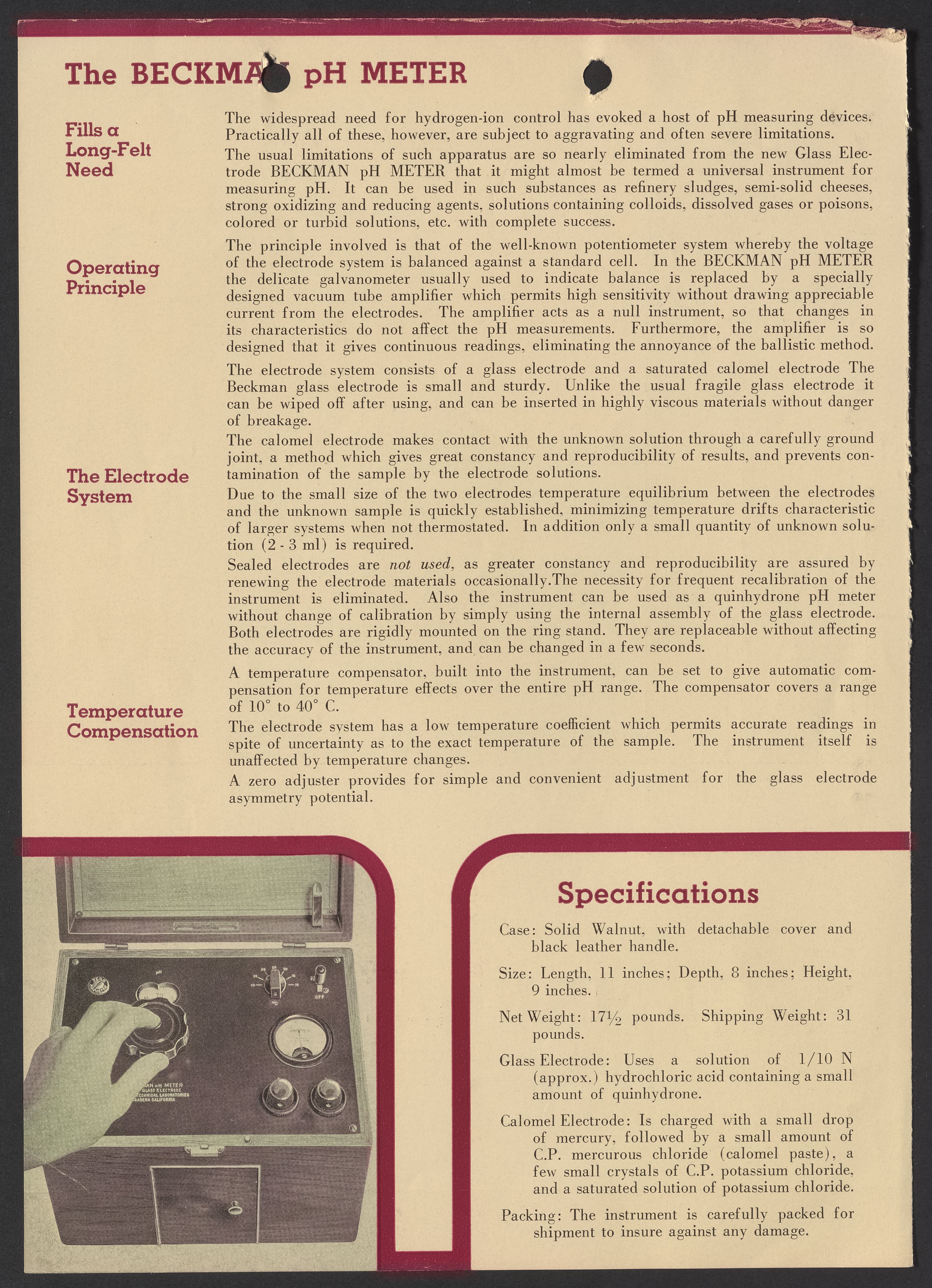 Beckman Instruments, Inc. “Beckman PH Meter (Glass Electrode) Brochure,” 1935–1940. Beckman Historical Collection, Box 20, Folder 2. Science History Institute. Philadelphia. https://digital.sciencehistory.org/works/44558f07m.