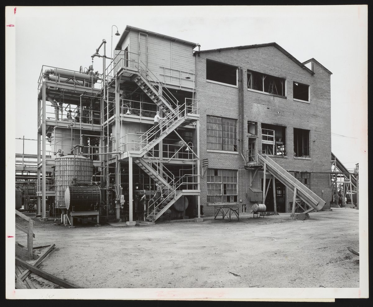 General view of the exterior of the manufacturing facilities for Toxaphene, an insecticide concentrate, at the Hercules Powder Company plant in Brunswick, Georgia. One of two Hercules plants specializing in naval stores, the Brunswick plant extracted rosin, turpentine, and pine oil from pine tree stumps in order to produce a range of chemicals used in the manufacture of varnishes, paints, adhesives, insecticides, textiles, and other industrial products. The employees visible on the stairs are identified as Homer Brogden (top) and Tommy Beasley.