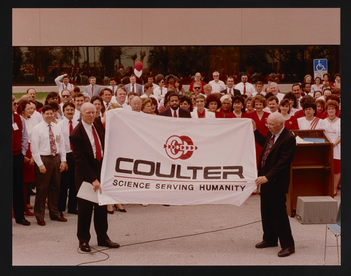 “Joseph and Walter Coulter, Holding a ‘Coulter - Science Serving Humanity’ Banner,” 1993. Beckman Historical Collection, Box 90, Folder 11. Science History Institute. Philadelphia. https://digital.sciencehistory.org/works/474299338.