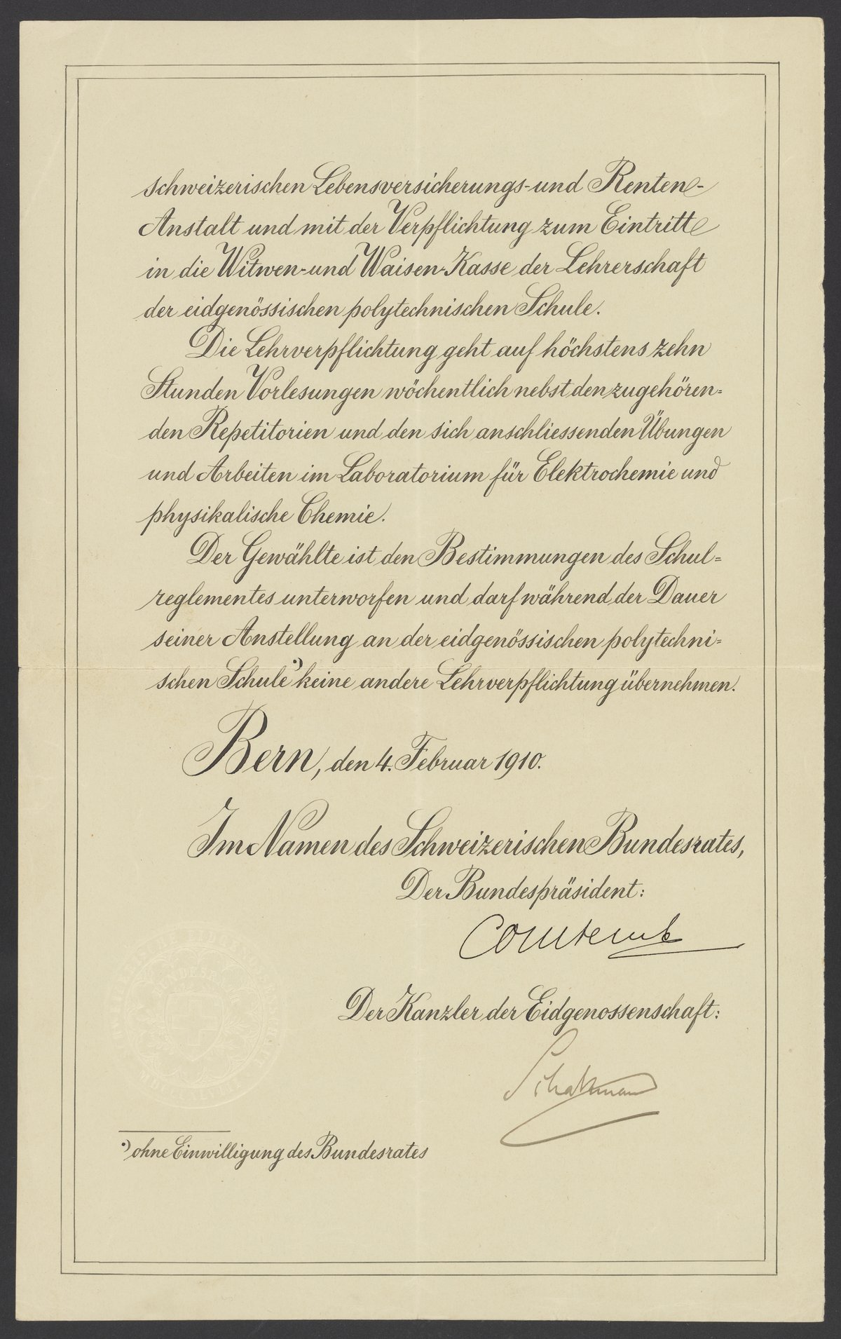 Switzerland. Bundesgericht. “Appointment Letter Granting a Professorship to Georg Bredig,” February 4, 1910. Papers of Georg and Max Bredig, Box 6, Folder 2. Science History Institute. Philadelphia. https://digital.sciencehistory.org/works/47bqyz8.