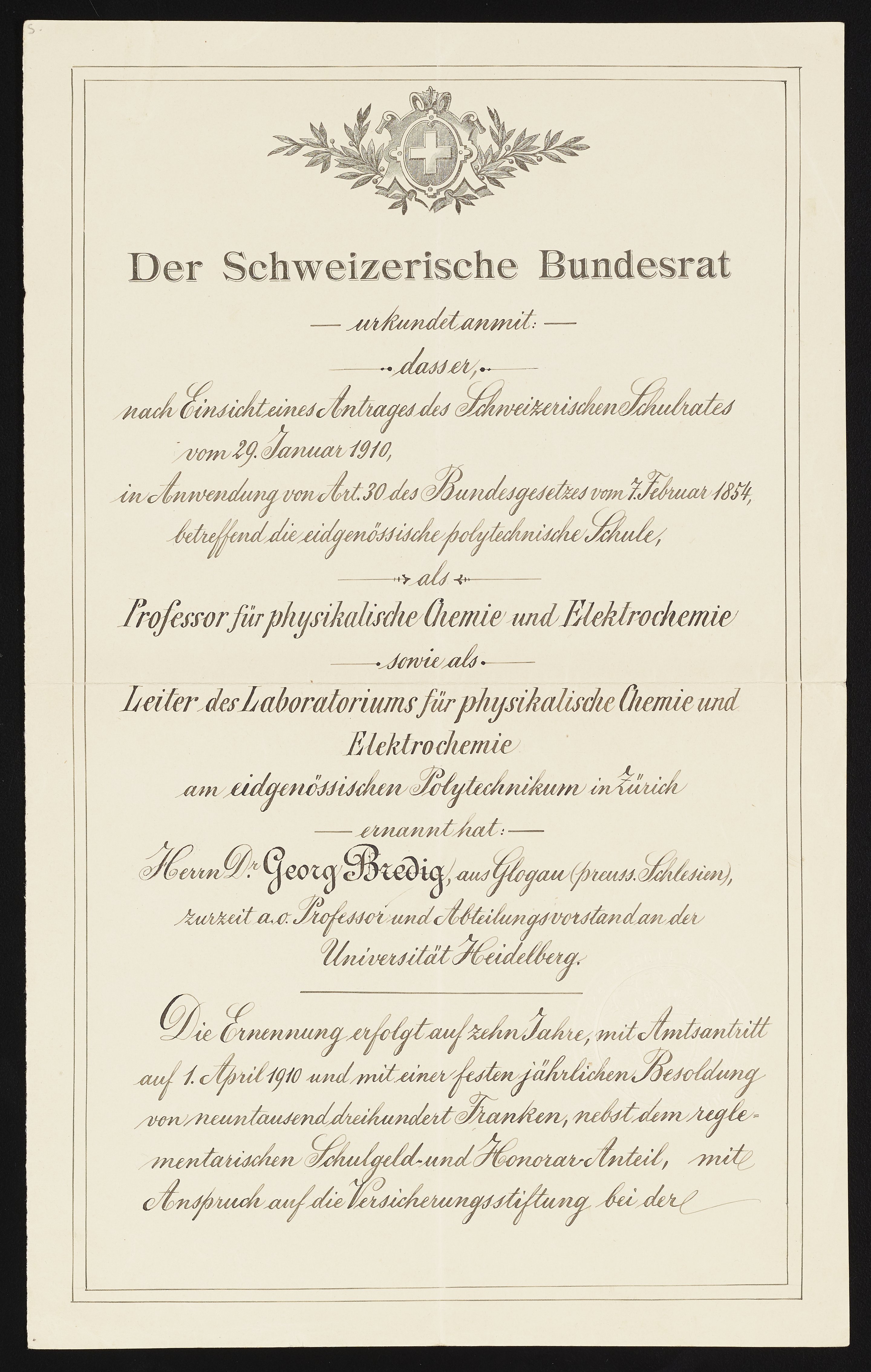 Switzerland. Bundesgericht. “Appointment Letter Granting a Professorship to Georg Bredig,” February 4, 1910. Papers of Georg and Max Bredig, Box 6, Folder 2. Science History Institute. Philadelphia. https://digital.sciencehistory.org/works/47bqyz8.