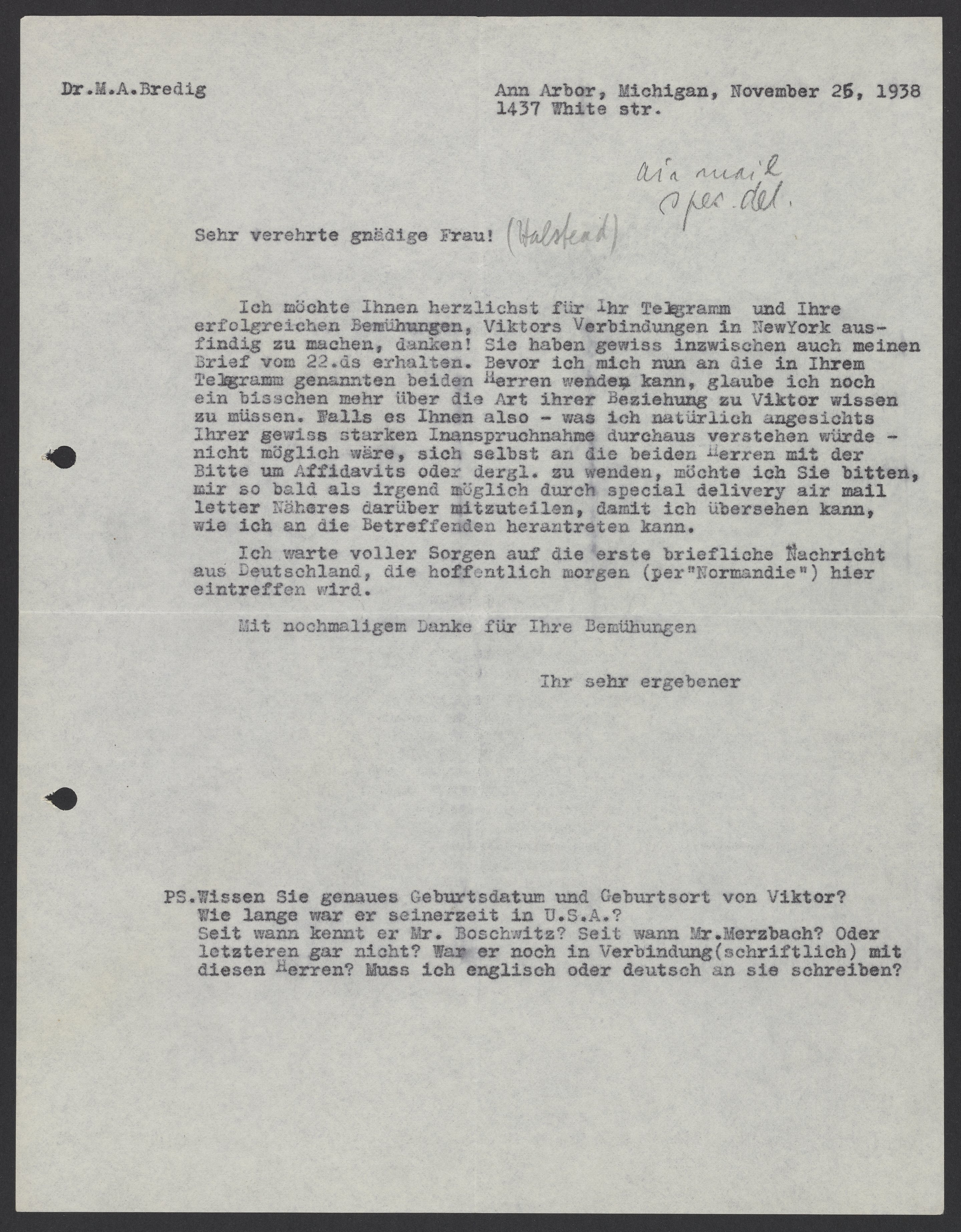 Letter from Max Bredig to Friedel G. Halstead, November 25, 1938