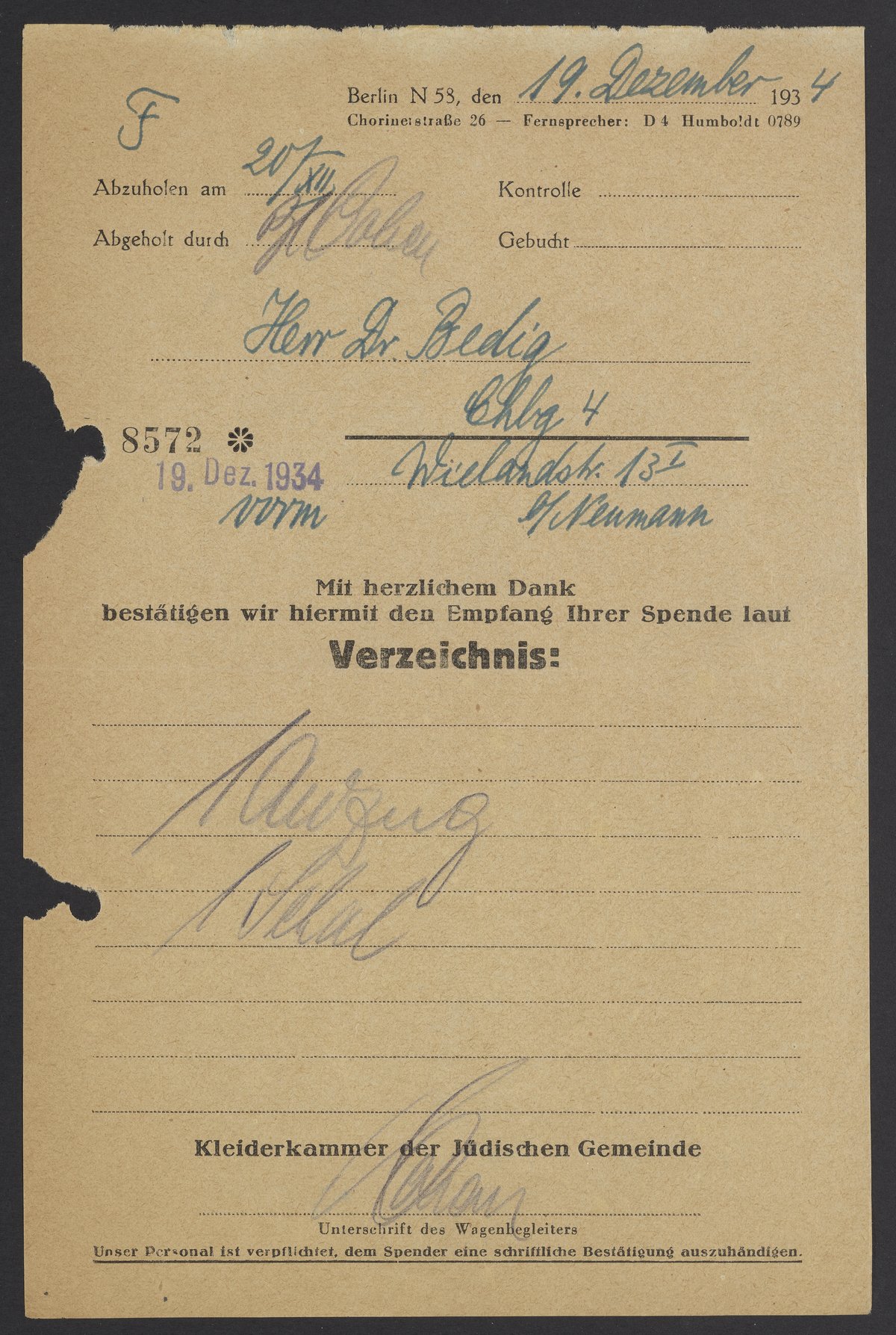 Receipt for donation from Kleiderkammer der Judischen Gemeinde