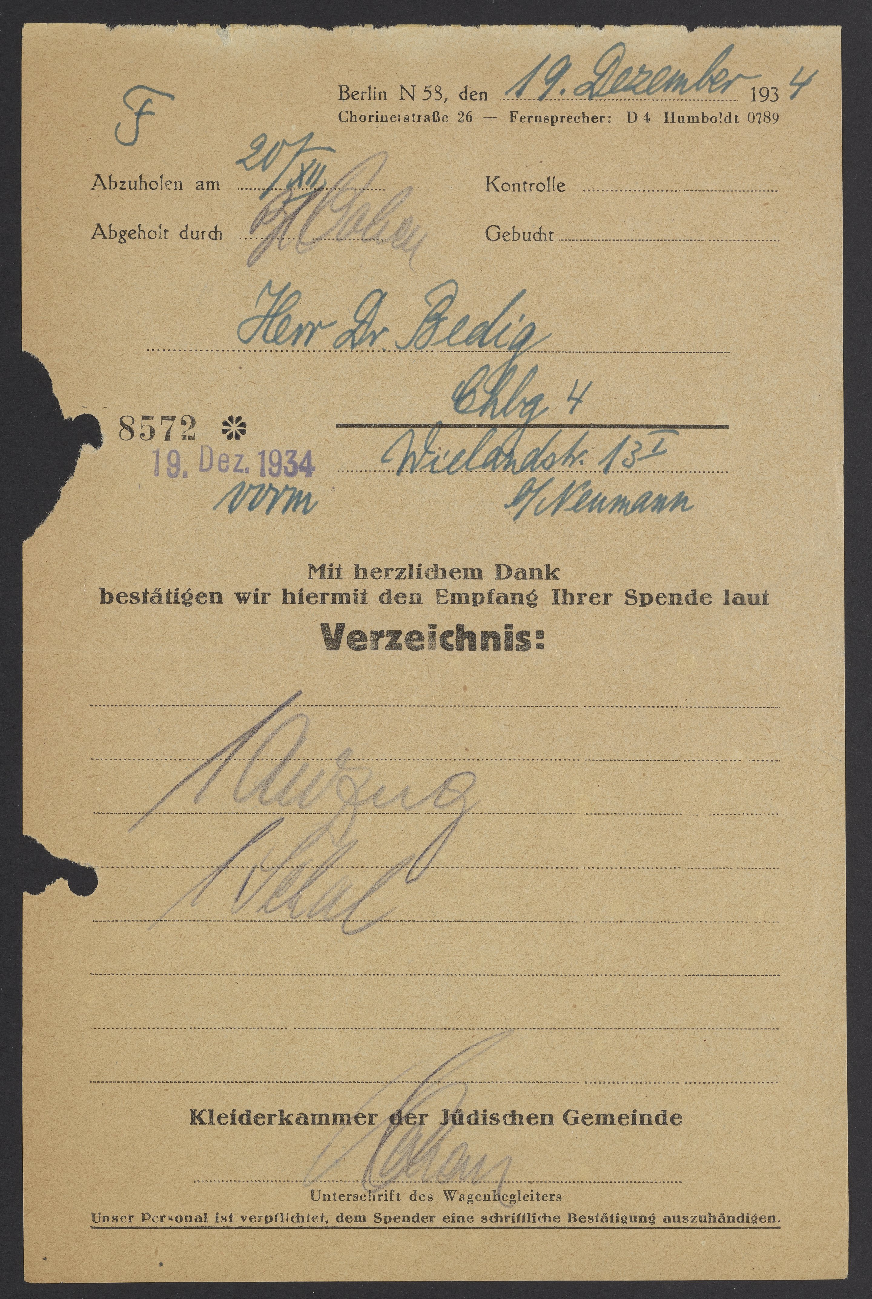 Receipt for donation from Kleiderkammer der Judischen Gemeinde