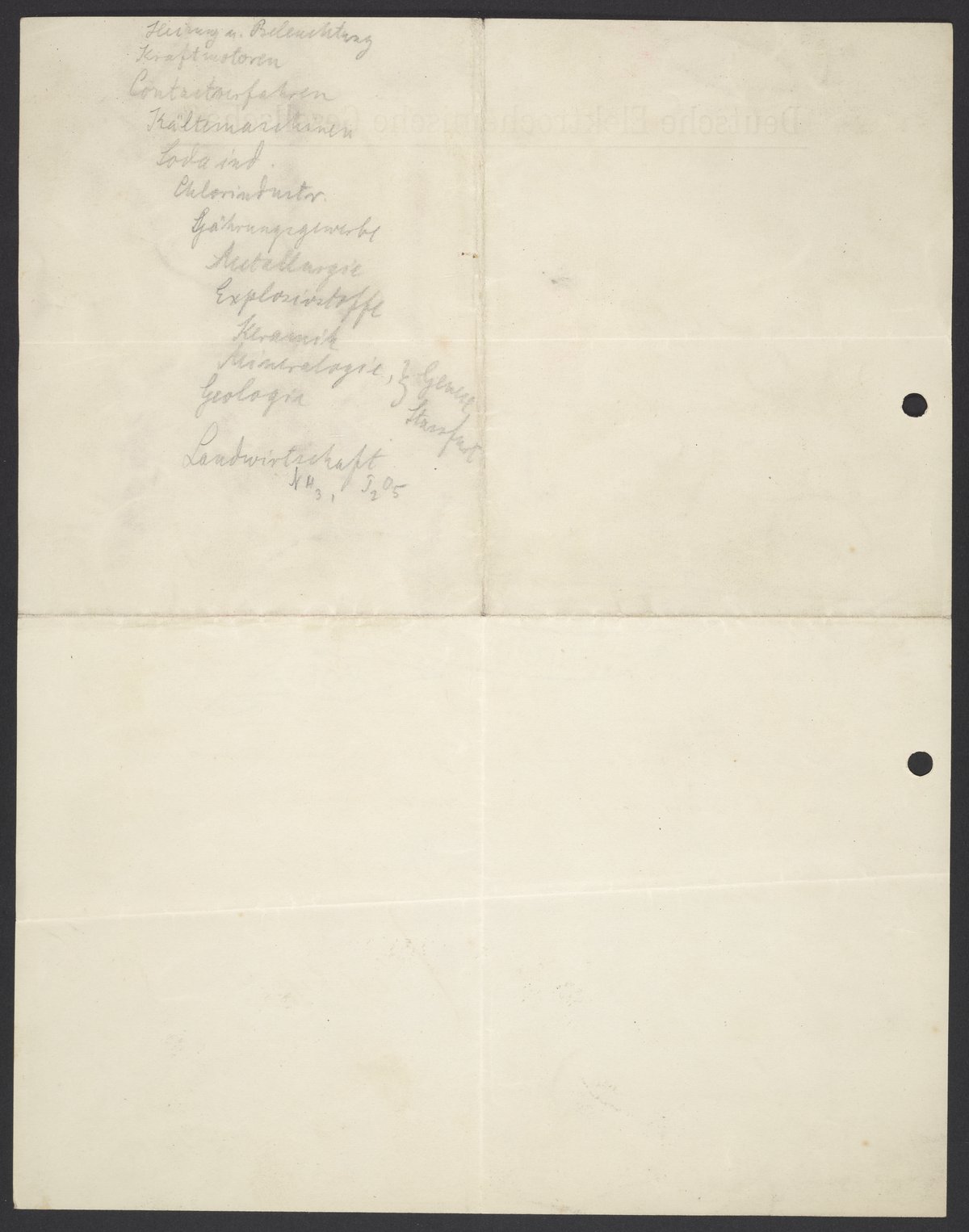 Vor eigner Zeit wurde mir von Dr. Wagner mitgetheilt daß Sie beabsichtigten eine Ausdehnung des Arbeitsgebiets für die D. P. G. vorzuschlagen und zwar im Sinne der mehr allgemein aufgefaßten physikalischen Chemie. Ich stehe diesem Vorschlag skepthisch gegenüber falls nur eine Lösung gewählt wird, welche uns das Zusammenwirken mit der Technik sichert. Wäre es nicht möglich einen derartigen für die Züricher Sitzung vorzubereiten?