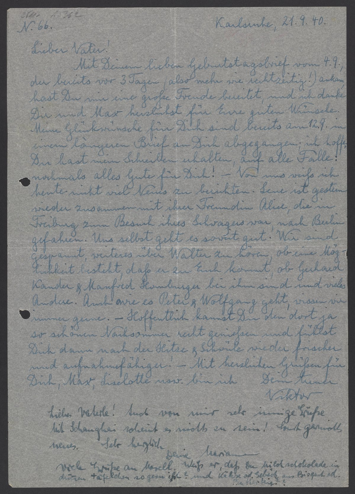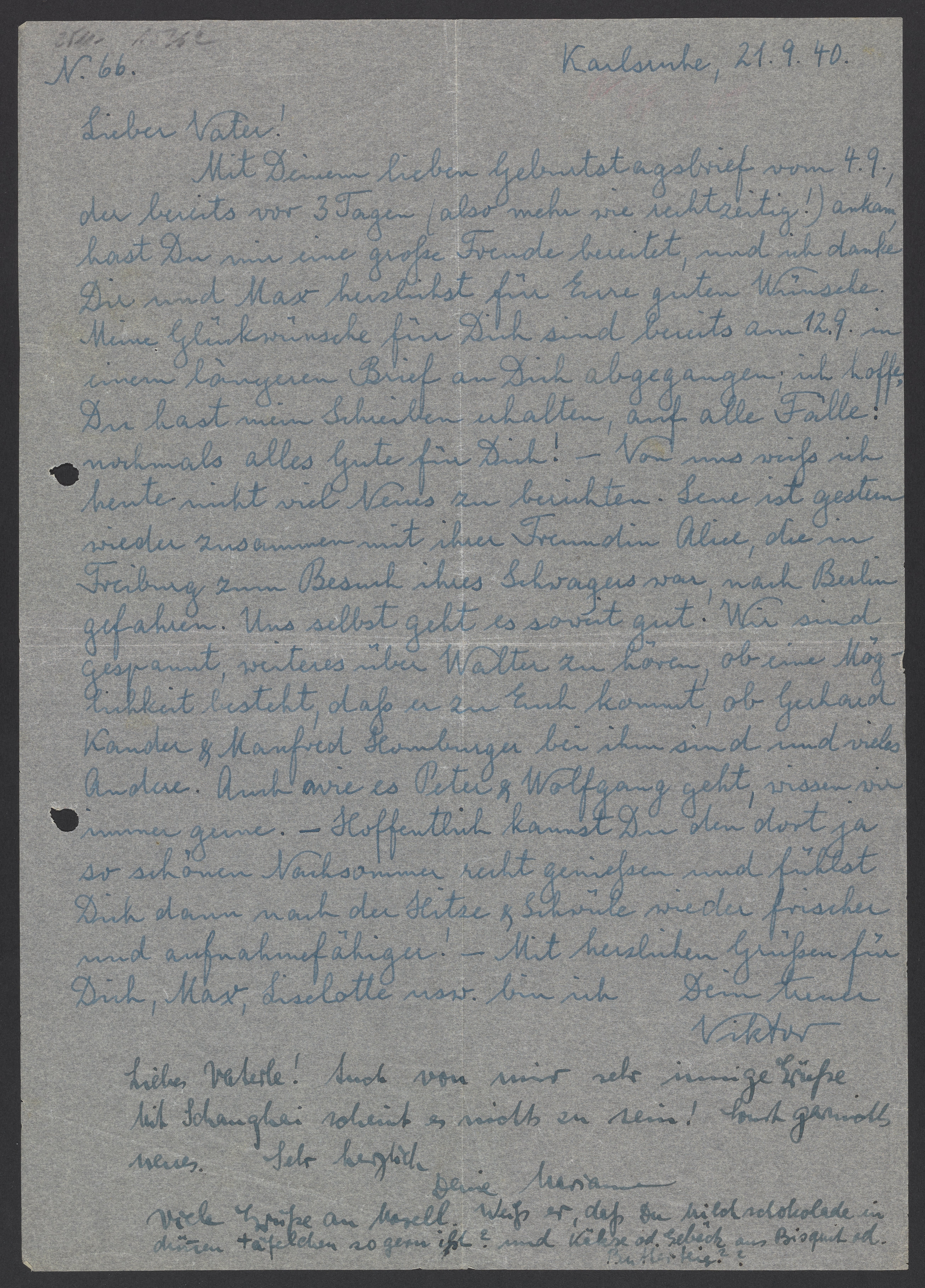 Mit Deinem lieben Geburtstagsbrief vom 4. 9., der bereits vor 3 Tagen (also mehr wie rechtzeitig) ankam, hast Du mir eine große Freude bereitet, und ich danke Dir und Max herzlichst für Eure guten Wünschen. Meine Glückwünsche für Dich sind bereits am 12. 9. in einem längeren Brief an Dich abgegangen; ich hoffe, Du hast mein Schreiben erhalten, auf alle Fälle: nochmals alles Gute für Dich! – Von uns weiß ich heute nicht viel Neues zu berichten. Lene ist gestern wieder zusammen mit ihrer Freundin Aline, die in Freiburg zu Besuch ihres Schwagers war, nach Berlin gefahren. Uns selbst geht es soweit gut. Wir sind gespannt, weiteres über Walter zu hören, ob eine Möglichkeit besteht, dass er zu Euch kommt, ob Gerhard Kander & Manfred Homburger bei ihm sind und vieles Andere. Auch wie es Peter & Wolfgang geht, wissen wir immer gerne. – Hoffentlich kannst Du den dort ja so schönen Nachsommer recht genießen und fühlst Dich dann nach der Hitze & Schwüle wieder frischer und aufnahmefähiger! – Mit herzlichen Grüssen für Dich, Max, Liselotte usw. bin ich Dein treuer Viktor.