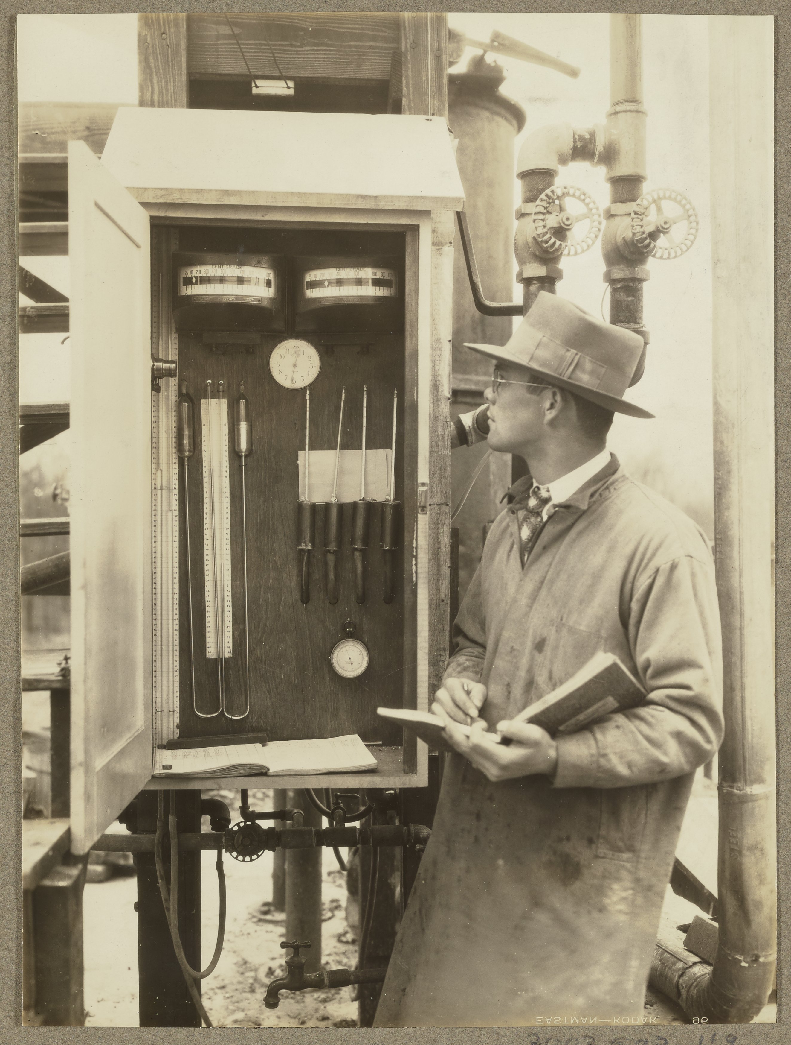 General view of the control panel for the experimental blast furnace at the U.S. Department of Agriculture's Fixed Nitrogen Research Laboratory located in Washington, D.C. The individual visible in the photograph is identified as Travis P. Hignett.
