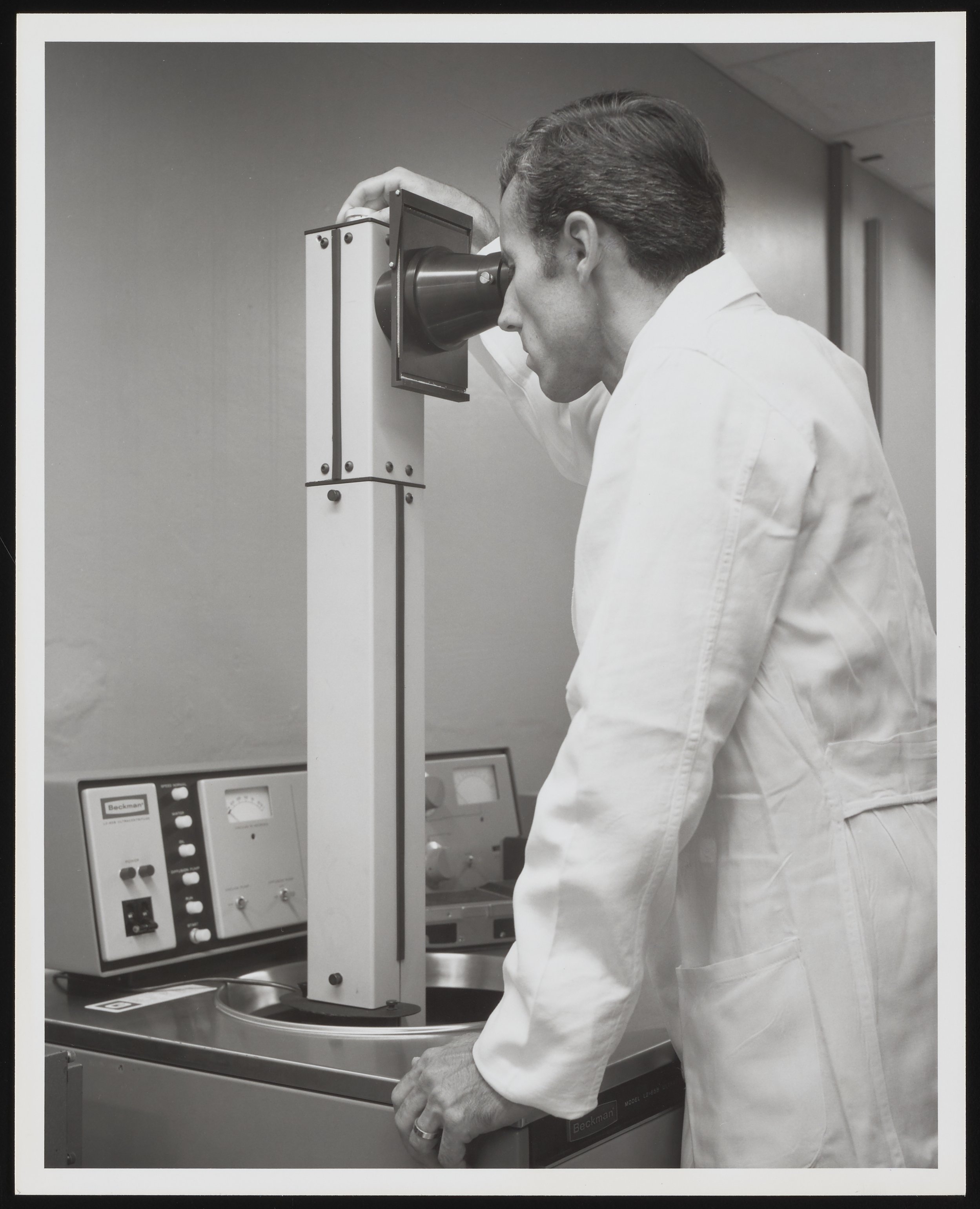 “Man Using a Schlieren Optics Device for a Spinco Preparative Centrifuge,” n.d. Beckman Historical Collection, Box 59, Folder 134. Science History Institute. Philadelphia. https://digital.sciencehistory.org/works/4b29b608f.