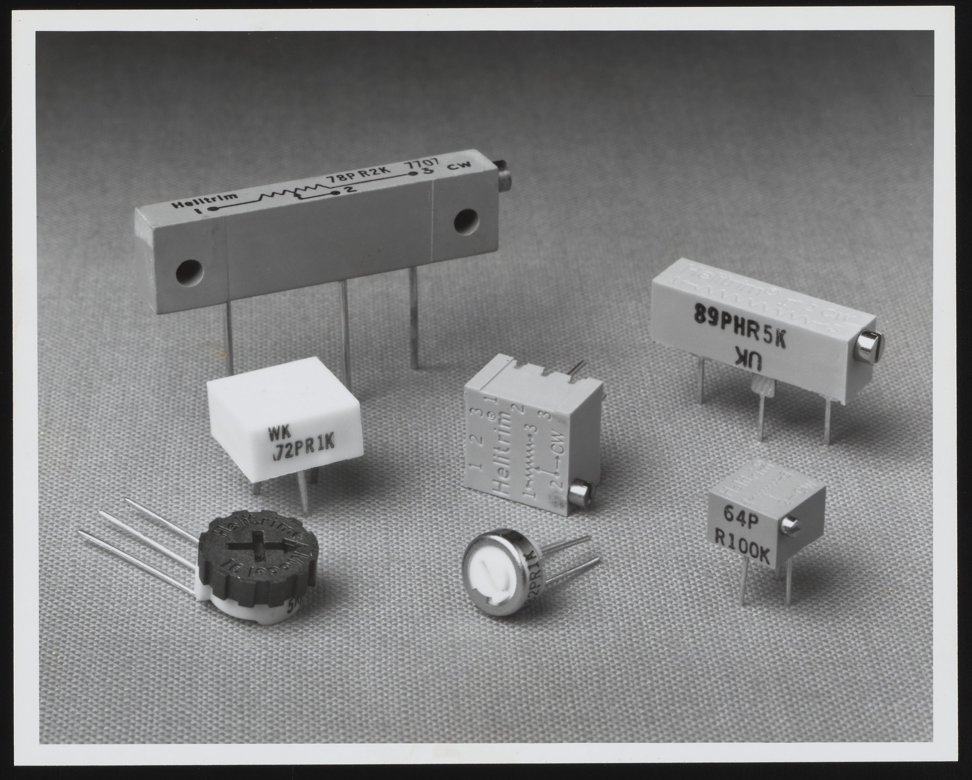 Small JPG1200 x 964px — 180 KBLarge JPG2880 x 2313px — 700 KBFull-sized JPG3110 x 2498px — 790 KBOriginal fileTIFF — 3110 x 2498px — 22.3 MBPotentiometers regulate the flow of electricity, like the volume dial on a radio. In 1940, Arnold O. Beckman was unsatisfied with dials on the market, so he designed his own helical potentiometers, or helipots, for use in his popular pH meter. The precision of this dial caught the eye of the MIT Radiation Laboratory’s secret radar project during World War II. Beckman redesigned the helipot to meet the needs of the United States military and set up a separate company, also called Helipot, to keep up with the demand for these knobs. In the 1950s, Helipot was reincorporated into Beckman Instruments as the Helipot Division and continued to make potentiometers and other electrical components for decades, those tiny dials becoming staples of the electronics manufacturing industry.