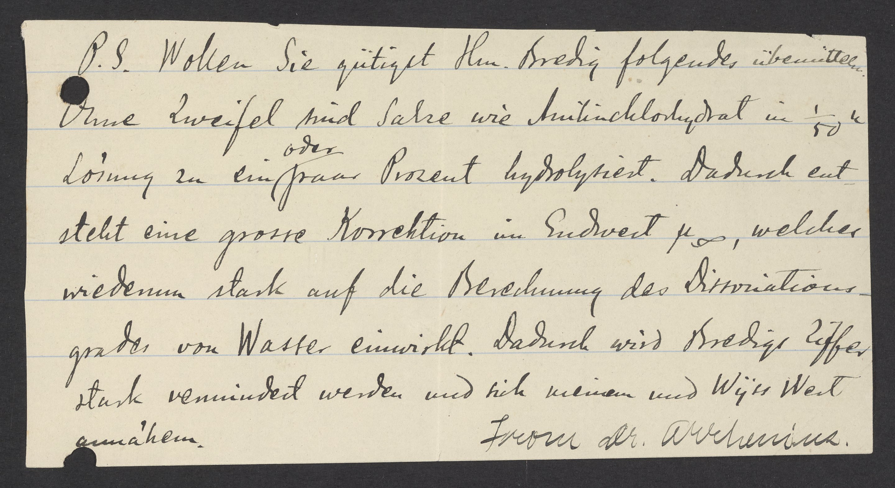 Note from Svante Arrhenius (1859-1927) to an unidentified recipient in which Arrhenius requests that Georg Bredig (1868-1944) be updated on a corrected calculation for an experiment.