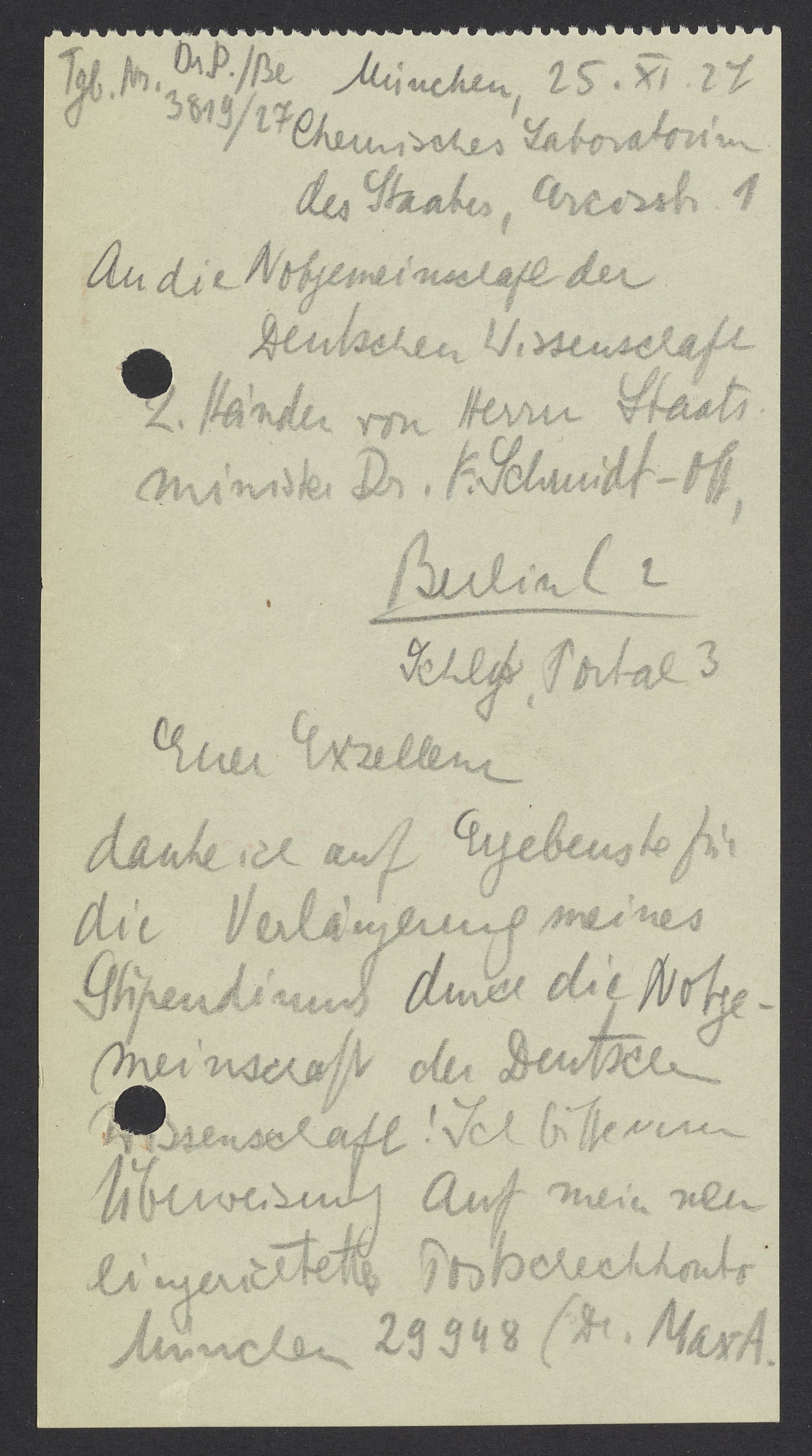 Euer Exzellenz danke ich auf Ergebenste für die Verlängerung meines Stipendiums durch die Notgemeinschaft der Deutschen Wissenschaft! Ich bekomme Überweisung auf mein Postscheckkonto München 29948 (Dr. Max A. Bredig, Theresienstr. 78).