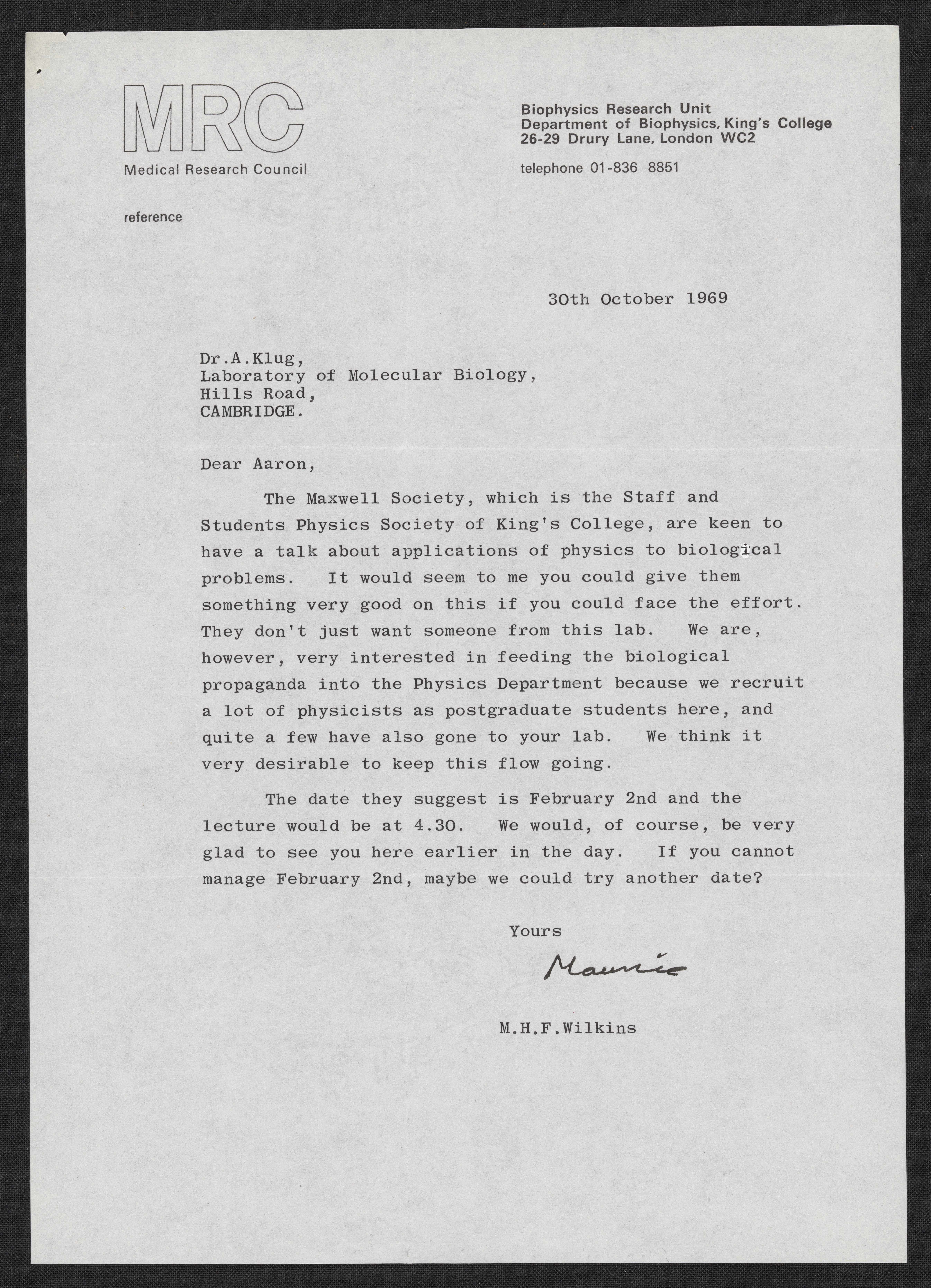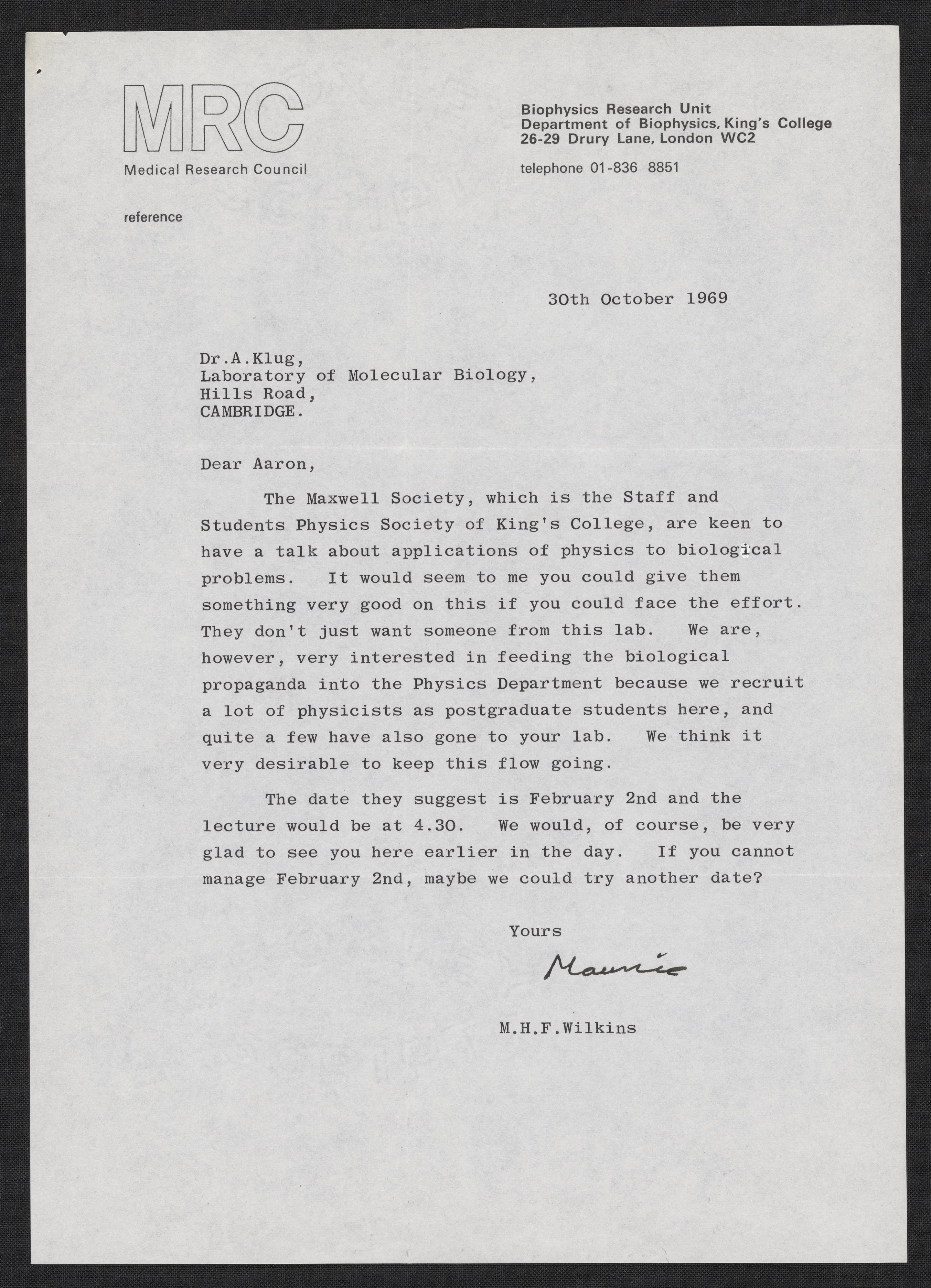 Maurice Wilkins (1916-2004) asks Aaron Klug (1926-2018) to give a talk for the Maxwell Society, a physics society at King's College.
