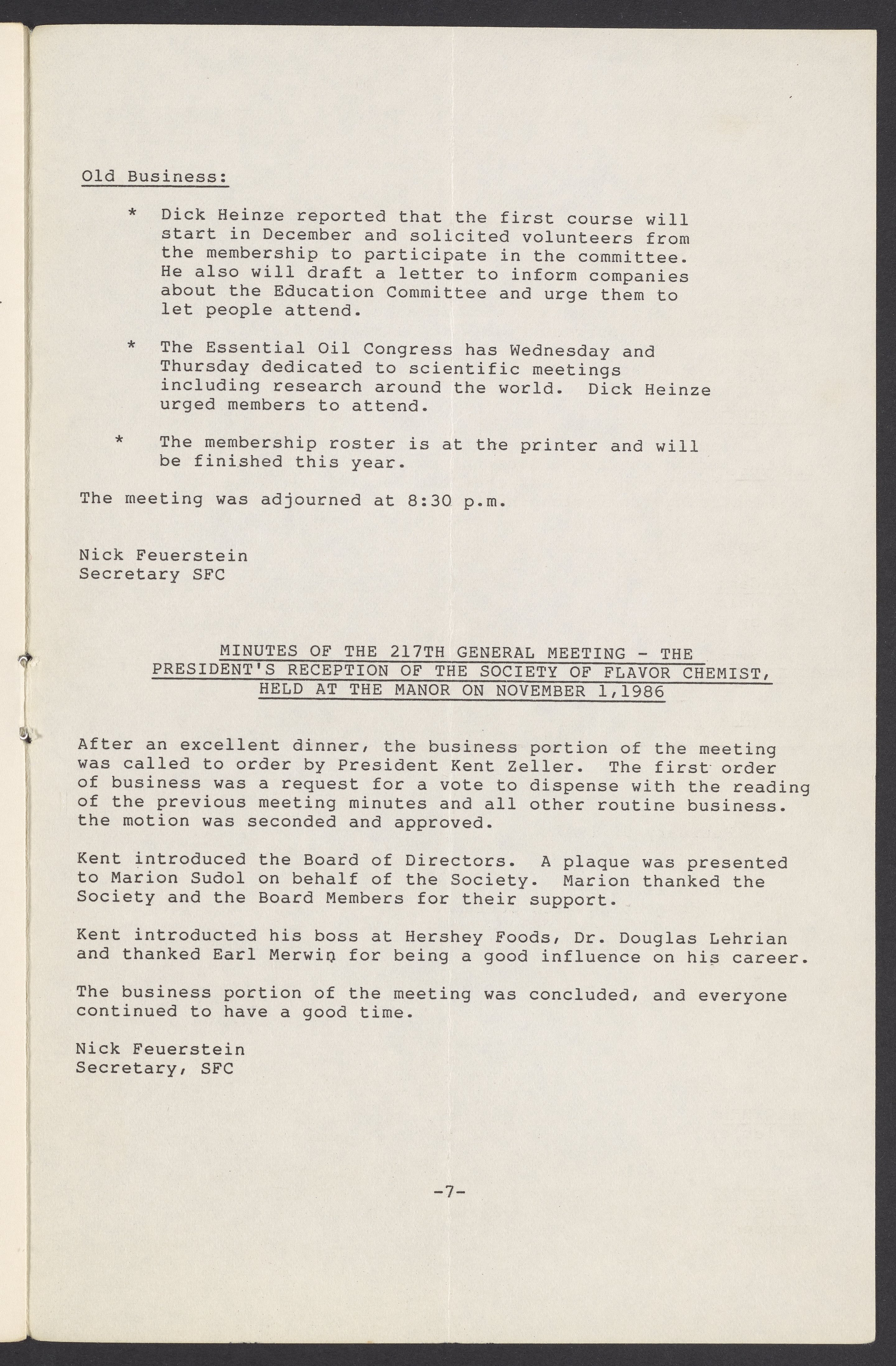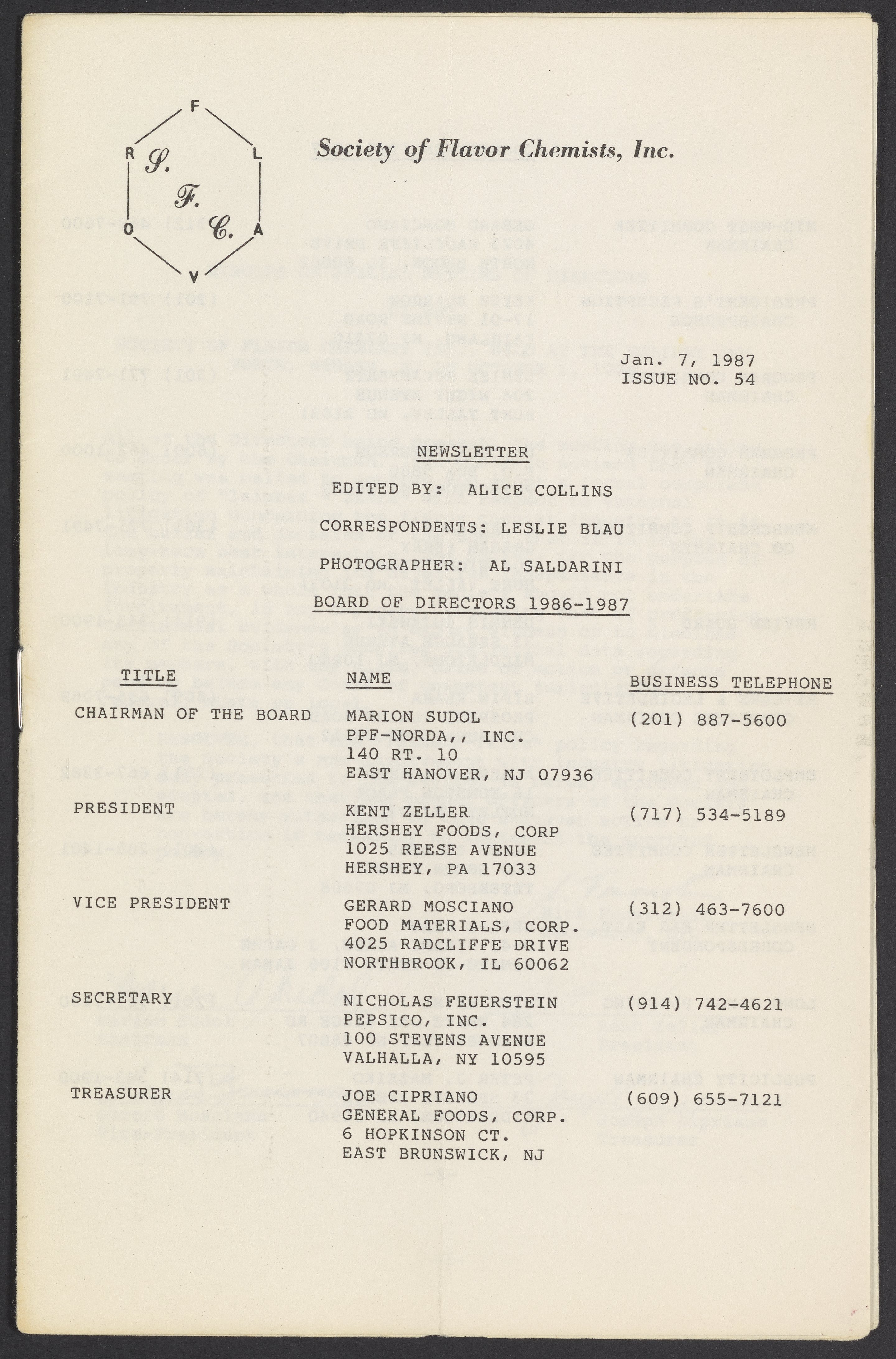 Society of Flavor Chemists. “Society of Flavor Chemists Newsletter, January 1987,” January 7, 1987. Society of Flavor Chemists Newsletters , Box 1, Folder 1. Science History Institute. Philadelphia. https://digital.sciencehistory.org/works/4cnqchv.