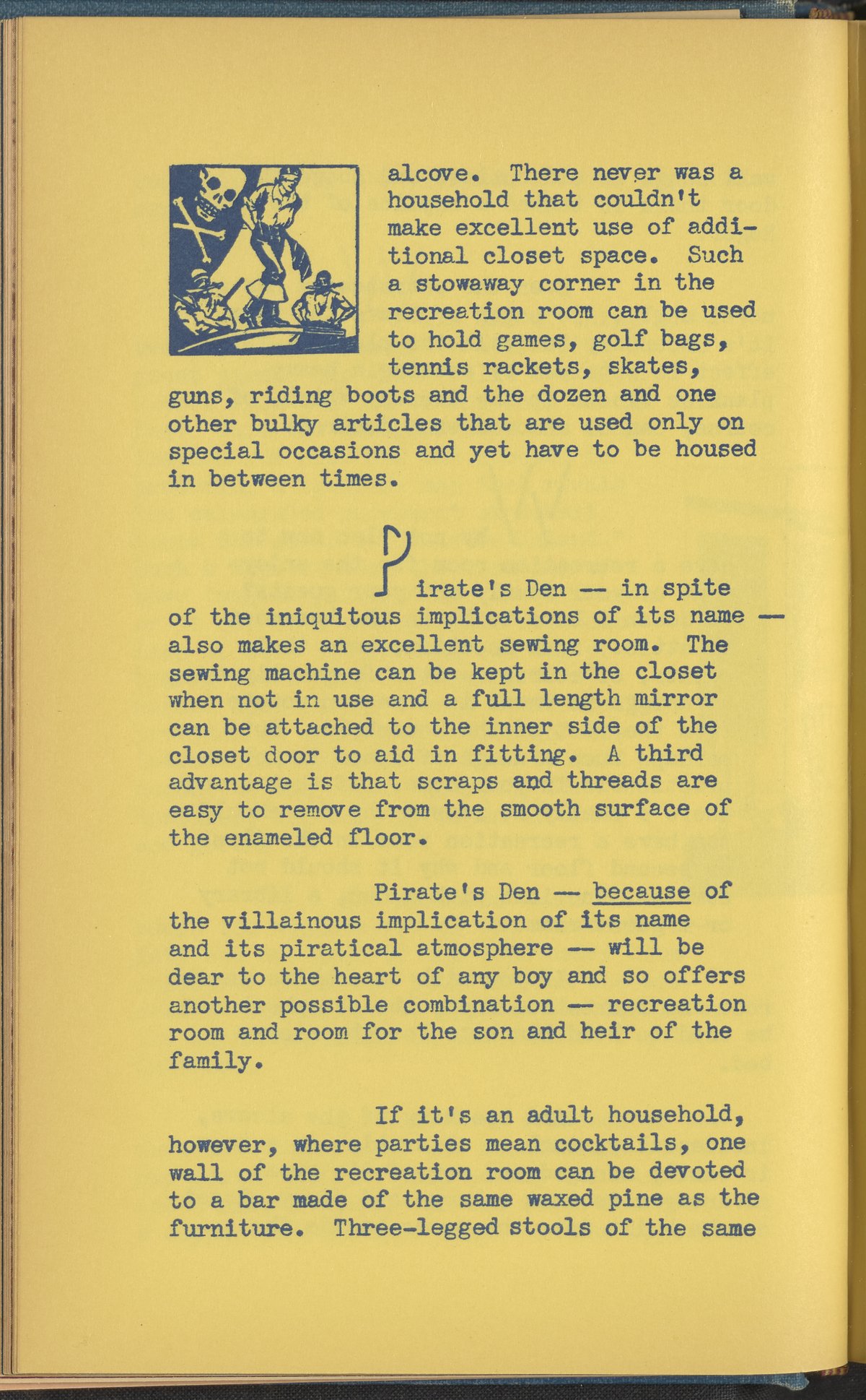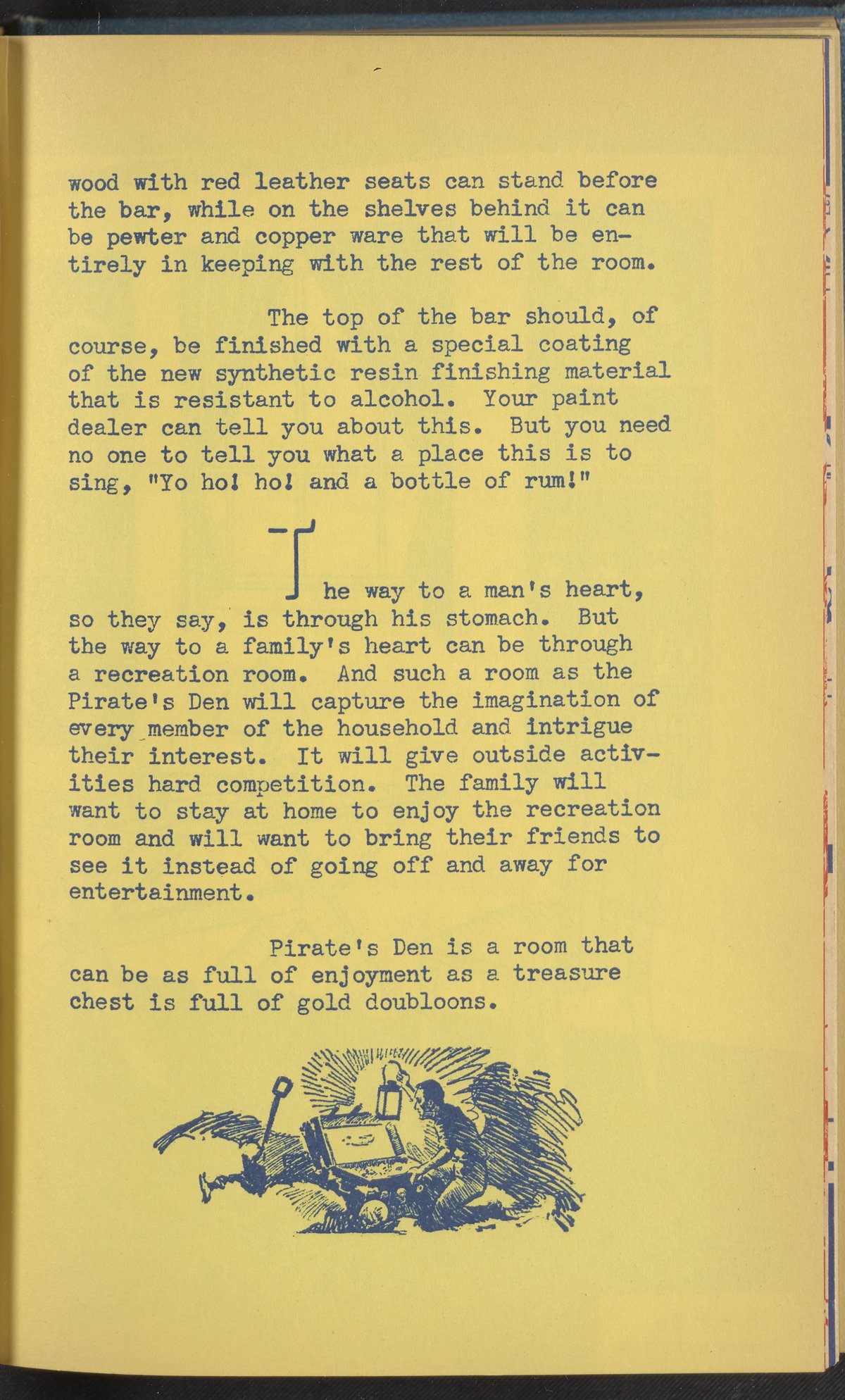 Booklet corresponding to a radio broadcast program created by the National Paint, Varnish, and Lacquer Association. The booklet describes a recreation room decorated with a nautical theme called the Pirate's Den. Provides inspiration for homeowners seeking to decorate a recreational space in their home. Includes small stylized illustrations throughout and decorated covers.