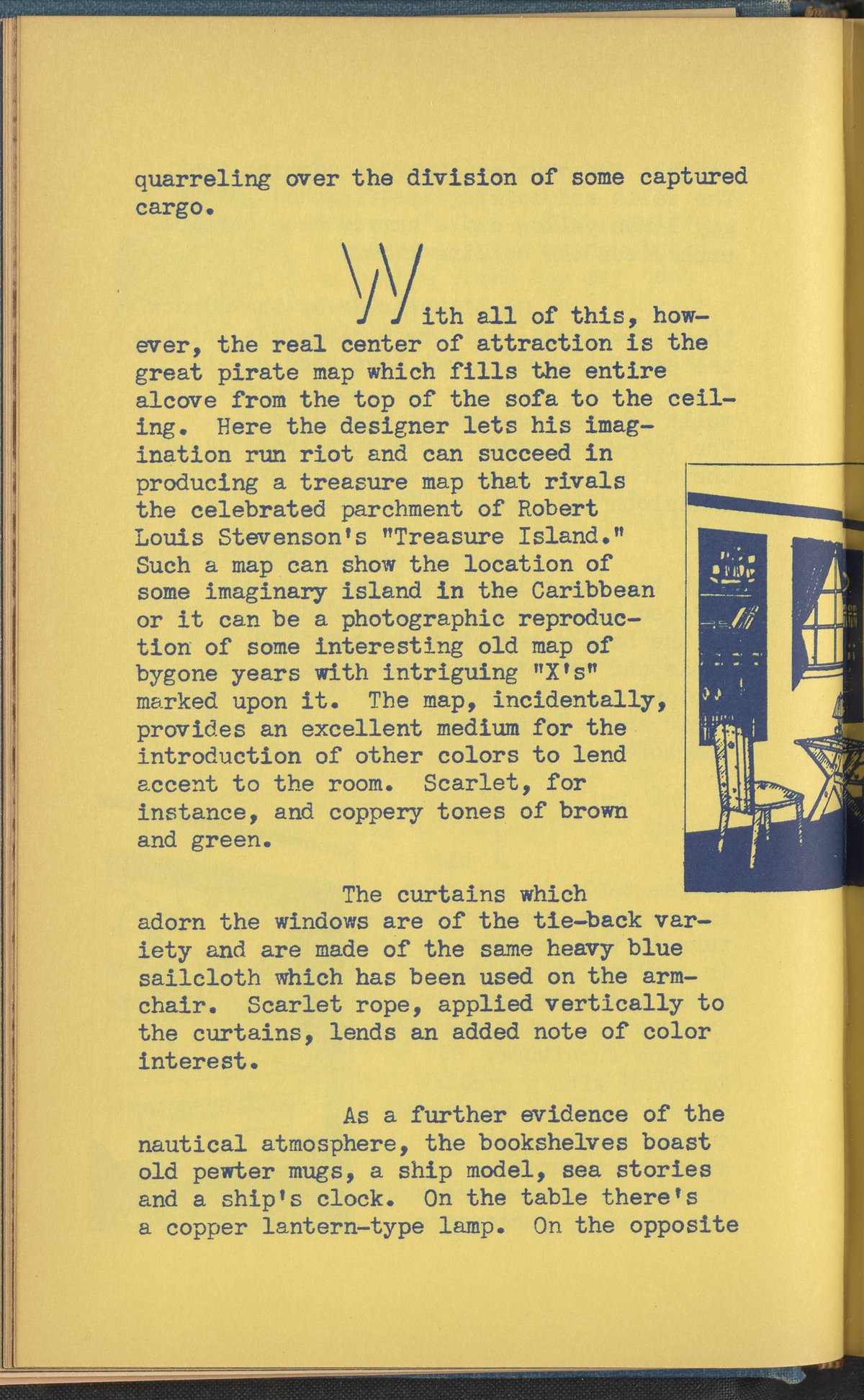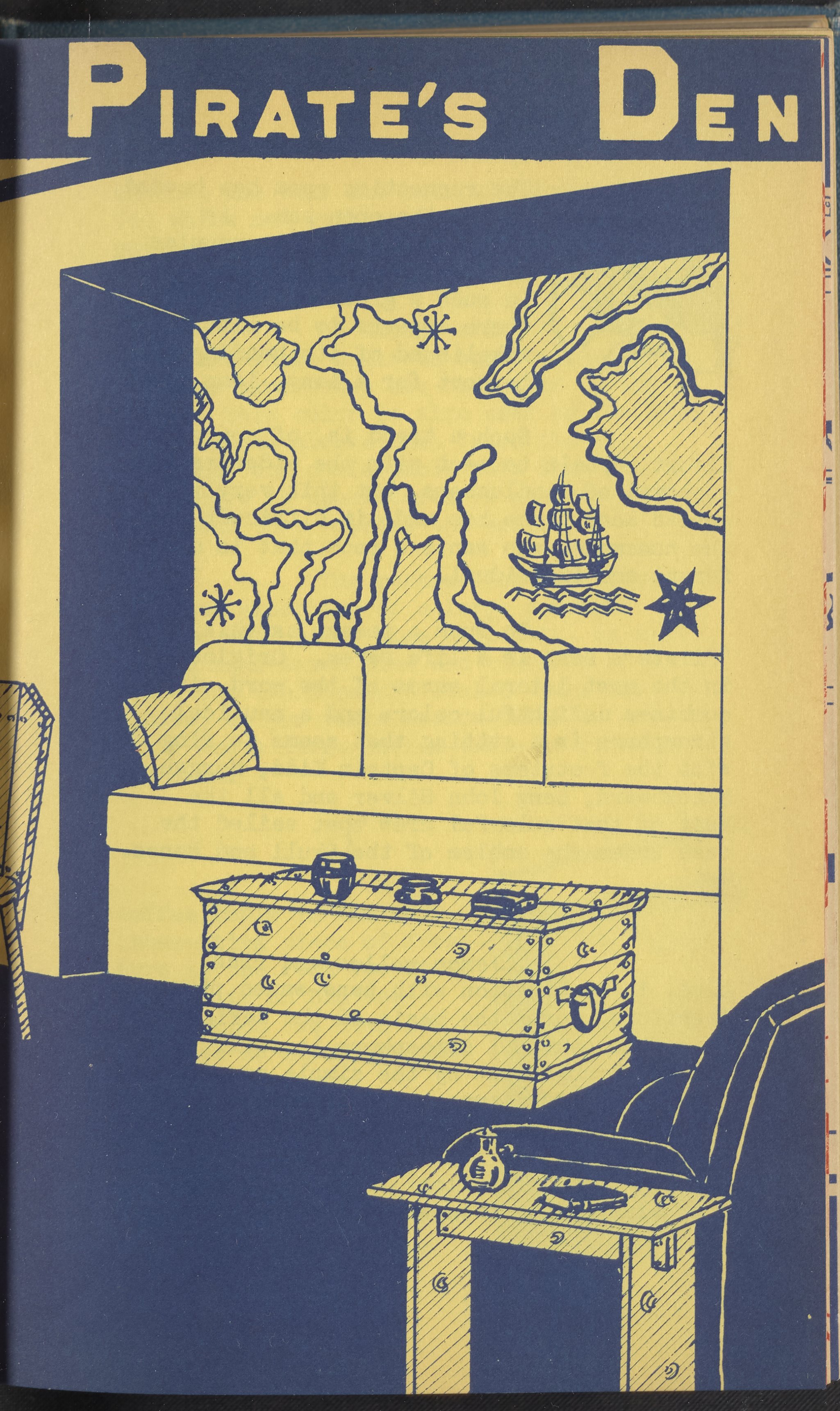Booklet corresponding to a radio broadcast program created by the National Paint, Varnish, and Lacquer Association. The booklet describes a recreation room decorated with a nautical theme called the Pirate's Den. Provides inspiration for homeowners seeking to decorate a recreational space in their home. Includes small stylized illustrations throughout and decorated covers.