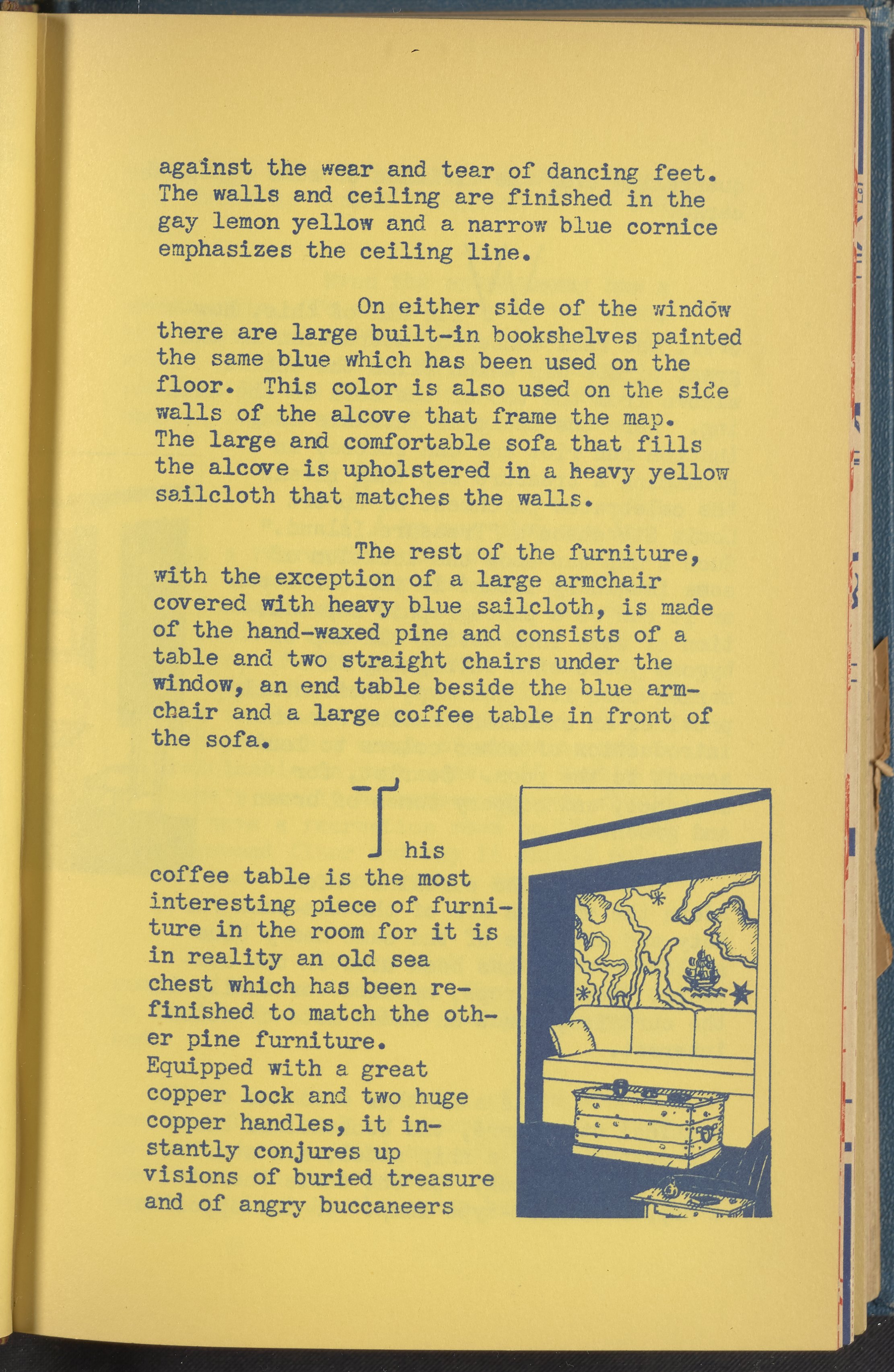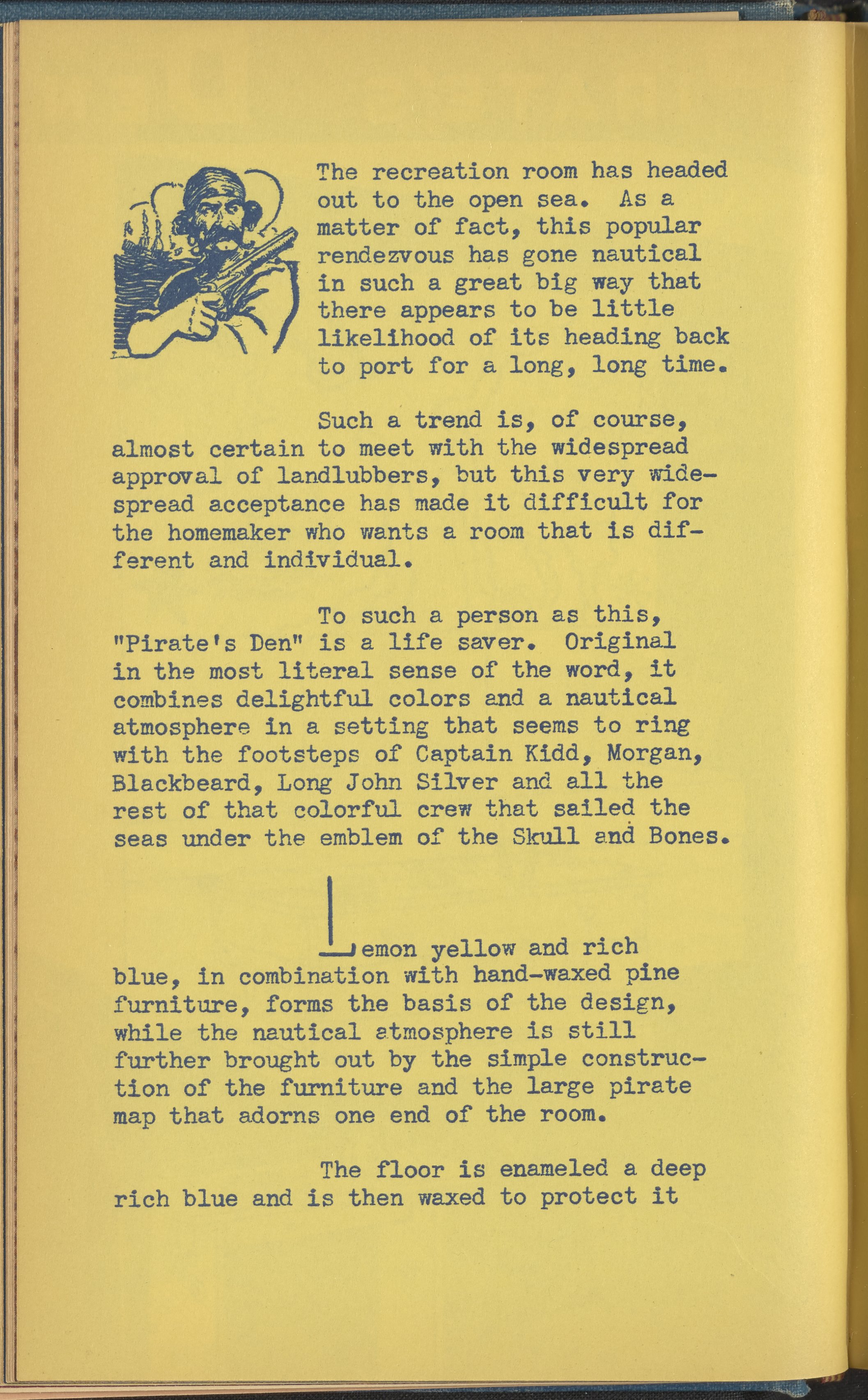 Booklet corresponding to a radio broadcast program created by the National Paint, Varnish, and Lacquer Association. The booklet describes a recreation room decorated with a nautical theme called the Pirate's Den. Provides inspiration for homeowners seeking to decorate a recreational space in their home. Includes small stylized illustrations throughout and decorated covers.