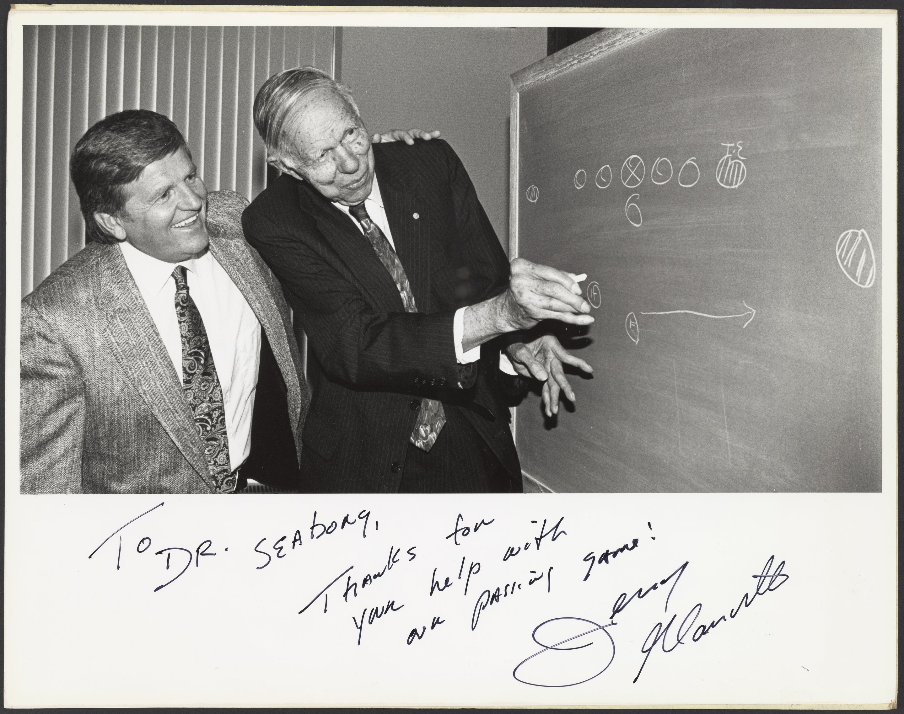 Glenn T. Seaborg (1912-1999) stands with an unidentified man at a chalkboard. Seaborg draws an arrow to indicate a formation for a play in American football. The photograph is inscribed with the message, “Thank you for help with our passing game!”, signed by Jerry Glanville (1941-), a coach in the National Football League and later in Major League Football.