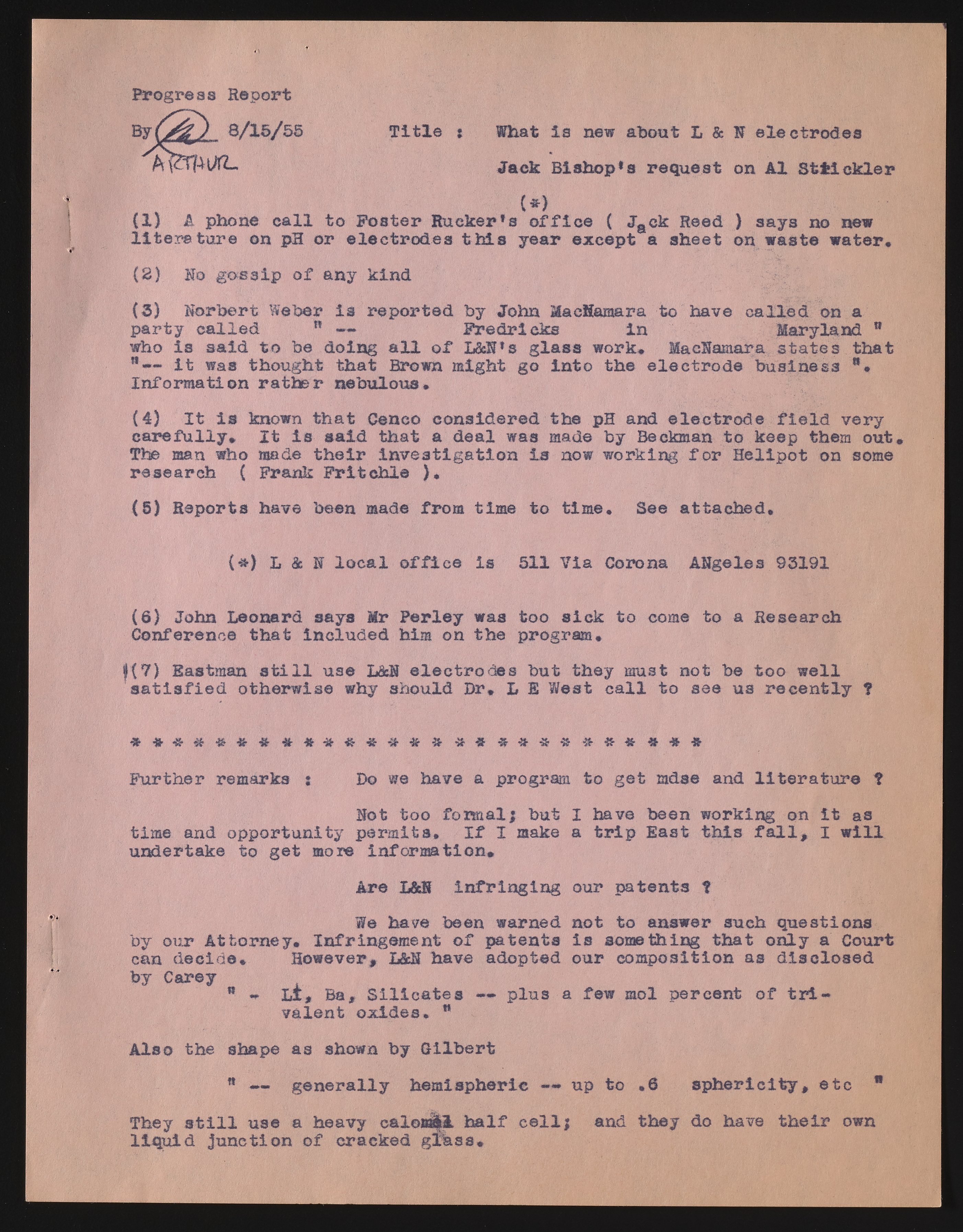 Arthur, Edwin P. “Progress Report on Glass Electrodes,” August 15, 1955. Beckman Historical Collection, Box 19, Folder 16. Science History Institute. Philadelphia. https://digital.sciencehistory.org/works/4f16c371f.