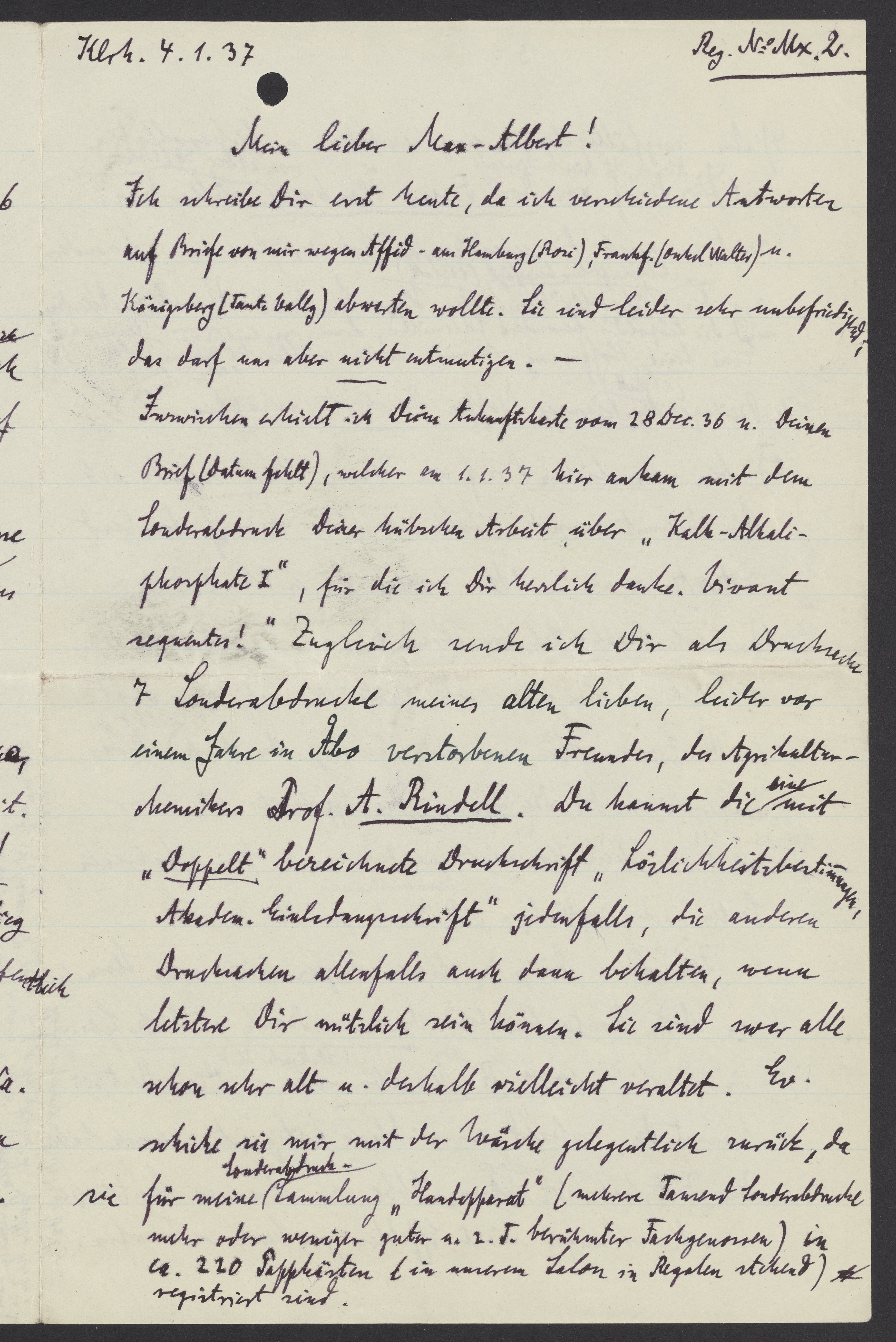 Inzwischen erhielt ich Dein Ankunftskarte von 28 Dec. 36 u. Deinen Brief (Datum fehlt), welcher am 1.1.37. hier ankam mit dem Sonderabdruck Dieser hübschen Arbeit über „Kalk-Alkali-phosophate I“, fuer die ich Dir herzlich danke. Vivant regentis! Zugleich sende ich Dir als Drucksache 7 Sonderabdrucke meines alten lieben, leider vor einem Jahre in Abo verstorbenen Freundes, des Agrikulturchemikers Prof. A. Rindell. Du kannst die eine mit „Doppelt“ bezeichnete Druckschrift „Löslichkeitsbestimmungen, Akadem. Einladungschrift“ jedenfalls, die anderen Drucksachen allenfalls auch dann behalten, wenn letztere Dir nützlich sein können. Sie sind zwar alle schon sehr alt u. deshalb vielleicht veraltet. Ev. schicke sie mir mit der Wäsche gelegentlich zurück, da fuer meine Sammlung „Handapparat“ (mehrere Tausend Sonderabdrucke mehr oder weniger guter und zum Teil berühmter Fachgenossen) in ca. 220 Pappkästen (in unserem Salon in Regalen stehend) registriert sind.