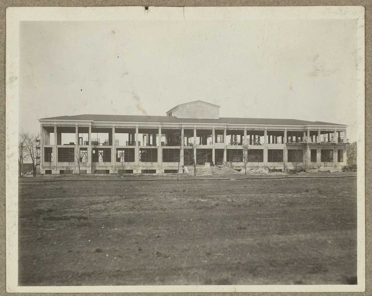 Exterior view of a chemical warfare research laboratory under construction at American University near Washington, D.C. American research concerning chemical warfare was initially organized under the Bureau of Mines, which operated several university and industrial laboratories to study the design of gas masks, physiological effects of toxic compounds, and the design and development of new toxic agents. As chemical research work expanded, the need for a large central laboratory to coordinate these activities led to the construction of a laboratory at American University, then located on the outskirts of Washington, D.C.