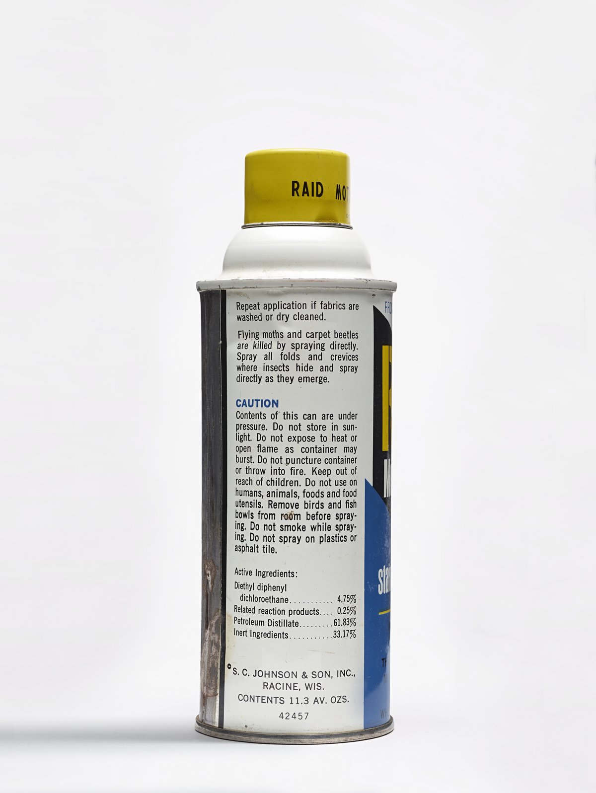 Small JPG1200 x 1597px — 126 KBLarge JPG2880 x 3833px — 554 KBFull-sized JPG7760 x 10328px — 3.1 MBOriginal fileTIFF — 7760 x 10328px — 229 MBRaid brand insecticide aerosol spray can with yellow, white, blue, and black text on white, black, and blue label. Round yellow cap.