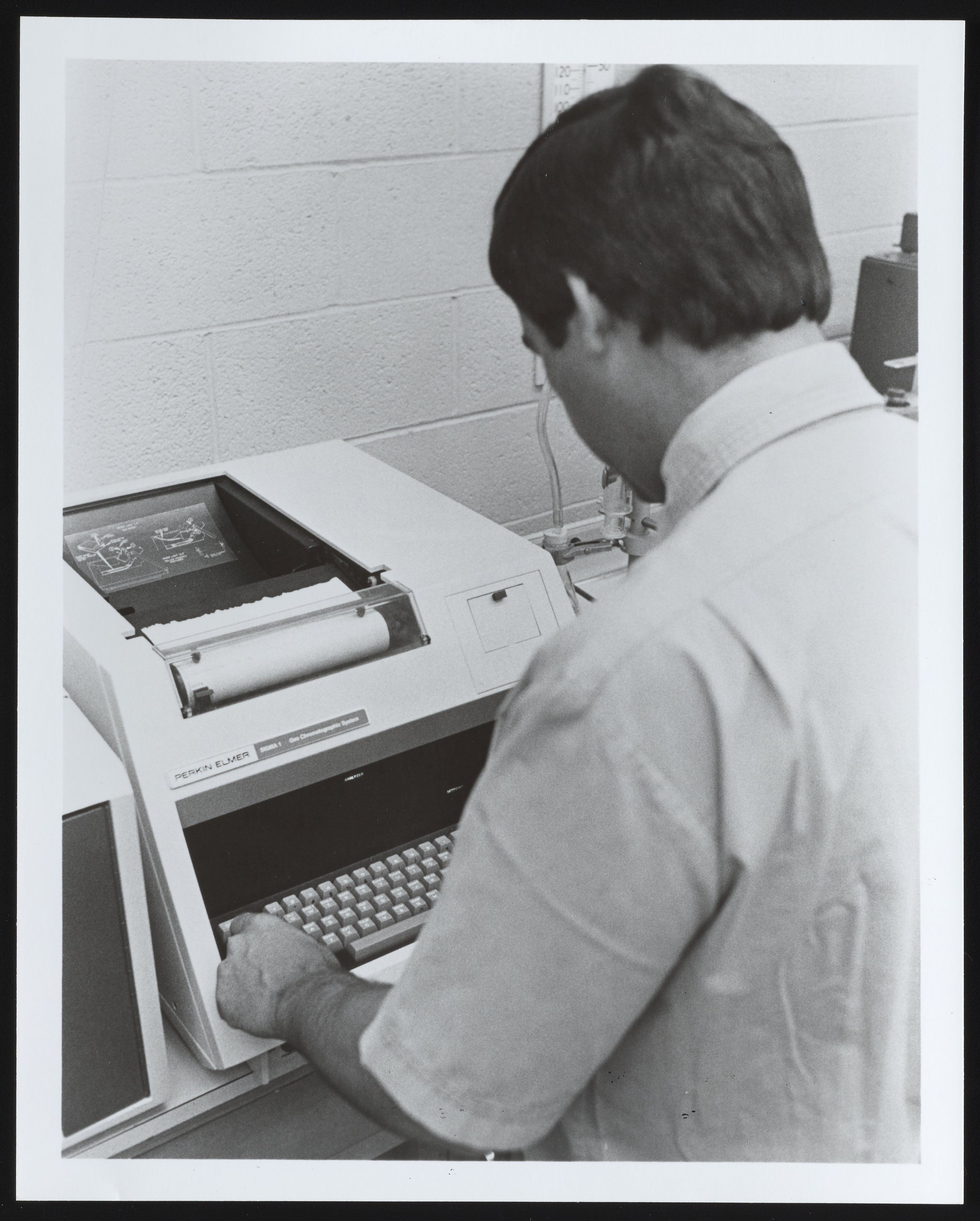 Close-up view of employee Larry Weathington operating a Perkin-Elmer Sigma 1 Gas Chromatograph System in a test laboratory associated with the Georgia Power Company. Per notations accompanying the photograph, the system is used to interpret the results of analyses of the cooling and insulating oils used in the company's substation transformers. Notably, such analyses pinpoint the causes of potential failures in the transformers, thus allowing for preventative maintenance without power shutdowns.