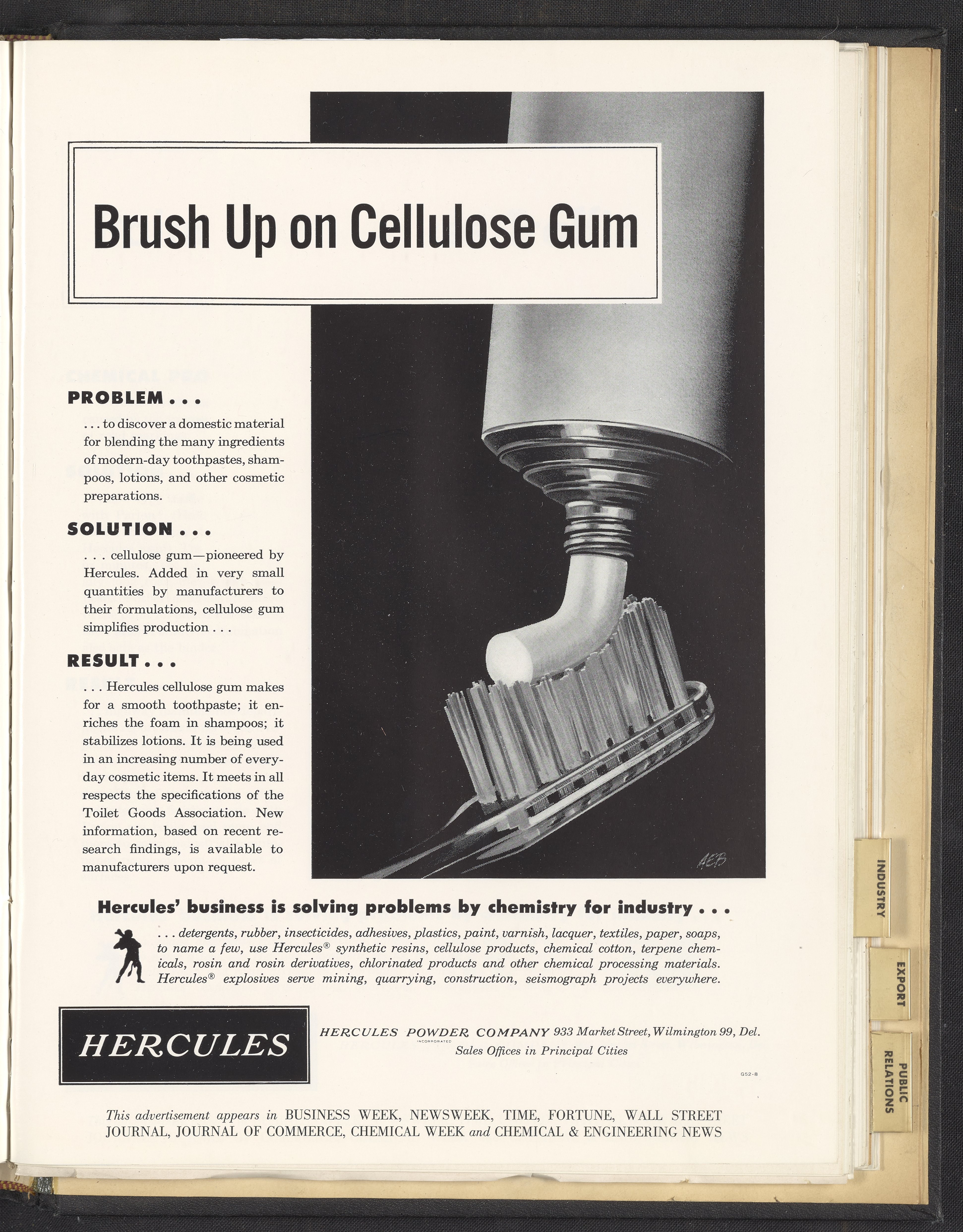 Hercules Incorporated. “Brush Up on Cellulose Gum.” 1952 Hercules Advertisements, 1952. Records of Hercules Incorporated, Volume 1952. Science History Institute. Philadelphia. https://digital.sciencehistory.org/works/4jwl5wi.