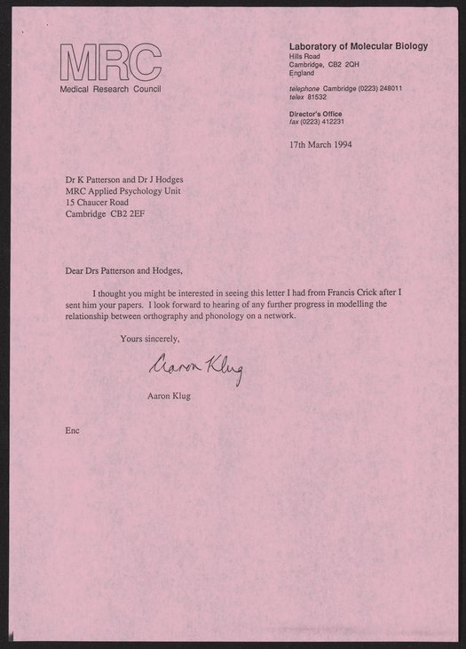 Klug, A. (Aaron), Sir. “Letter from Aaron Klug to Karalyn Patterson and John Hodges, March 17, 1994,” March 17, 1994. History of Molecular Biology Collection, Box 20, Folder 5. Science History Institute. Philadelphia. https://digital.sciencehistory.org/works/4kzjahn.